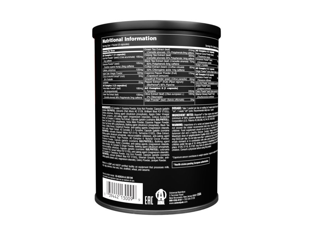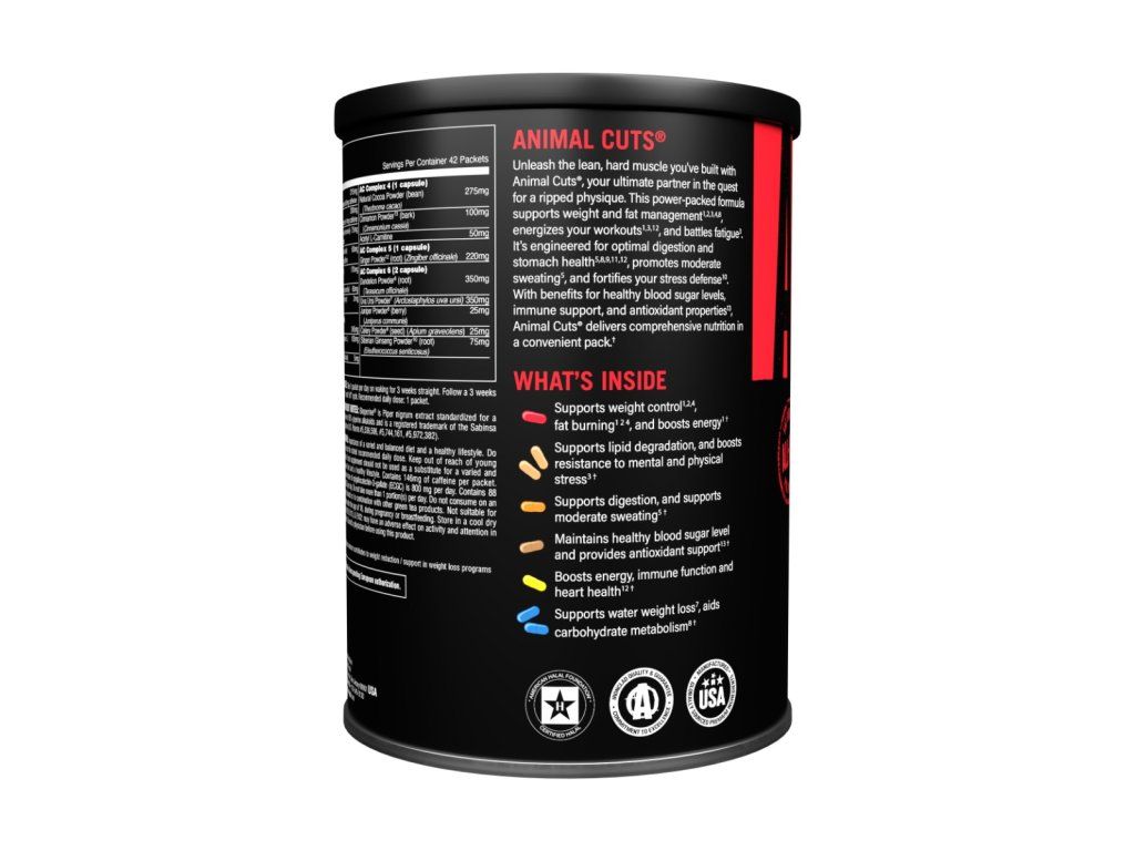 Animal Cuts je komplexný spaľovač tuku, ktorý je ideálne kombinovať s kalorickým deficitom a aktívnym životným štýlom. Obsahuje 6 jedinečných nabitých zmesí, v ktorých nájdete napríklad prášok z guarany či kofeín, ktorý pri príjme 3 mg na kg telesnej hmotnosti približne jednu hodinu pred cvičením prispieva k zvýšeniu vytrvalostného výkonu. Okrem toho podporuje aj koncentráciu. Nechýba však ani komplex s podielom yerba maté prášku, extraktu zo zeleného a čierneho čaju, L-tyrozínu, škoricového prášku či ženšenu. Tento nabitý doplnok má navyše praktickú formu kapsúl, takže ho môžete mať vždy po ruke a jednoducho užívať.