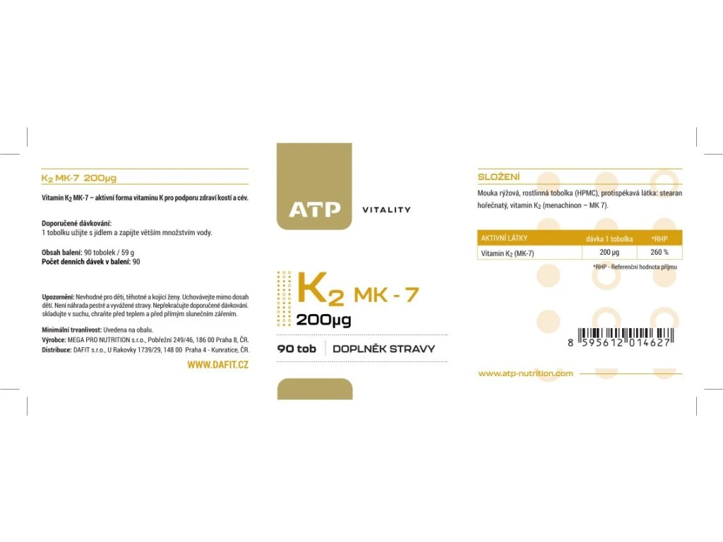 Vitamin K2 MK-7 – moderní forma Klíčový mikronutrient pro normální srážlivost krve a udržení normálního stavu kostí. Nejde jen o vitamin K. Jde o jeho použitou formu. - Moderní forma - „Menachinon-7 – biologicky stabilní forma vitaminu K2“. - Dlouhá aktivita - „Dlouhý biologický poločas.“ - Kostní péče „Vitamin K přispívá k udržení normálního stavu kostí.“ - Fyziologická rovnováha - „Vitamin K přispívá k normální srážlivosti krve.“ Vitamin K2 ve formě menachinon-7 (MK-7) představuje biologicky vysoce dostupnou formu vitaminu K s dlouhým biologickým poločasem. Přispívá k normální srážlivosti krve a k udržení normálního stavu kostí. Díky své stabilitě a efektivní distribuci v organismu je MK-7 považován za moderní formu suplementace vitaminu K. Jak vitamin K2 působí v organismu Vitamin K funguje v lidském těle jako kofaktor enzymu beta-glutamyl-karboxylázy, který aktivuje tzv. vitamin-K-dependentní proteiny. Tyto proteiny se účastní několika důležitých biologických procesů. Mezi nejznámější patří: protrombin, který se podílí na procesu srážení krve osteokalcin, protein produkovaný kostními buňkami matrix Gla protein (MGP), který se nachází v různých tkáních organismu. Aktivace těchto proteinů probíhá prostřednictvím procesu nazývaného beta-karboxylace, která je závislá právě na přítomnosti vitaminu K. Vitamin K má několik schválených zdravotních tvrzení Evropského úřadu pro bezpečnost potravin (EFSA), které jsou podložené vědeckými studiemi: vitamin K přispívá k normální srážlivosti krve vitamin K přispívá k udržení normálního stavu kostí Tyto tvrzení shrnují základní fyziologické role vitaminu K v lidském organismu. Význam formy MK-7 Forma MK-7 je v doplňcích stravy často preferována díky svým fyzikálně-chemickým vlastnostem. Oproti některým jiným formám vitaminu K má delší postranní izoprenoidní řetězec, který zvyšuje její lipofilitu a stabilitu v organismu. Prakticky to znamená, že MK-7 může zůstávat v krevním oběhu déle než například vitamin K1 nebo některé kratší formy menaquinonů. Proč dávka 200 mcg vitaminu K2 Dávka 200 mcg tak poskytuje dostatečné množství vitaminu K2 pro každodenní suplementaci a současně zohledňuje skutečnost, že příjem vitaminu K z běžné stravy může být u mnoha lidí nízký. Díky dobré biologické dostupnosti formy MK-7 může tato dávka přispívat k udržení optimální hladiny vitaminu K v organismu. Vitamin K2 jako součást vyvážené výživy Vitamin K je přirozenou součástí pestré stravy a nachází se v různých potravinách, zejména v zelené listové zelenině a fermentovaných produktech. Moderní životní styl a změny ve stravovacích návycích však mohou vést k nižšímu příjmu některých mikronutrientů. Doplňky stravy s vitaminem K2 MK-7 představují praktický způsob, jak tento důležitý vitamin doplnit a zajistit jeho pravidelný přísun v každodenní stravě. Doporučené dávkování: 1 tobolku užijte s jídlem a zapijte větším množstvím vody Tabulka nutričních hodnot: 1 tobolka Vitamin K2 (MK-7) 200 mcg (260 % RHP*) *% RHP - referenční hodnota příjmu (dříve doporučená denní dávka) Složení: Mouka rýžová, rostlinná tobolka (HPMC), protispékavá látka: stearan hořečnatý, vitamin K2 (menachinon – MK 7). Upozornění:Nevhodné pro děti, těhotné a kojící ženy. Uchovávejte mimo dosah dětí. Není náhrada pestré a vyvážené stravy. Nepřekračujte doporučené dávkování. skladujte v suchu, chraňte před teplem a před přímým slunečním zářením.Jedná se o doplněk stravy.
