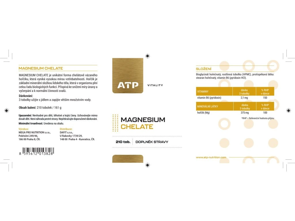 Magnesium chelate je unikátní forma chelátově vázaného hořčíku, která vyniká vysokou mírou vstřebatelnosti. Hořčík je základní minerální složkou lidského těla, která v organismu plní celou řadu biologických funkcí. Přispívá ke snížení míry únavy a vyčerpání a k normální činnosti svalů. Doporučené dávkování: 3 tobolky užijte s jídlem a zapijte větším množstvím vody Tabulka nutričních hodnot: 3 tob (% RHP) vitamin B6 (pyridoxin HCI) 2,1 mg (150 %) hořčík (Mg) 375 mg (100 %) RHP - referenční hodnota příjmu (dříve doporučená denní dávka) Složení: Bisglycinát hořečnatý, rostlinná tobolka (HPMC), protispékavá látky: stearan hořečnatý, vitamin B6 (pyridoxin HCI). Upozornění: Doplněk stravy. Nevhodné pro děti, těhotné a kojící ženy. Uchovávejte mimo dosah dětí. Není náhrada pestré stravy. Nepřekračujte doporučné dávkování.Jedná se o doplněk stravy.