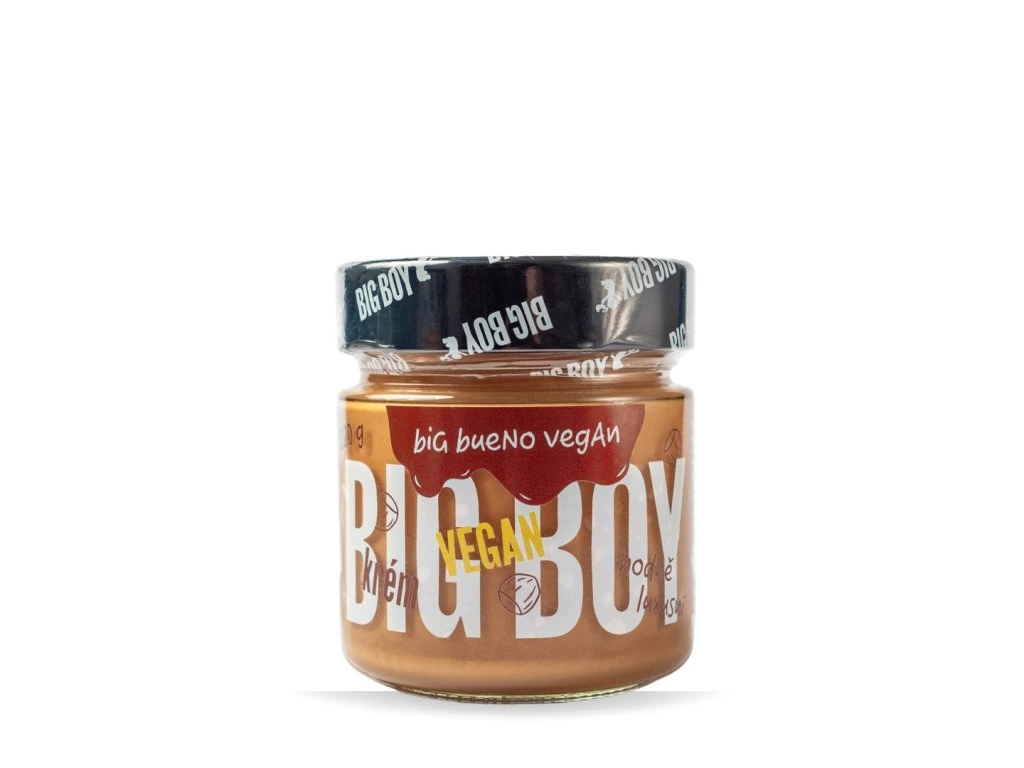 Naše nová verze Big Buena zaručeně potěší všechny vegany. S kokosovým mlékem, bez palmového oleje! V tomhle hodobóžo labůžo krémíku na tebe čekají pečlivě vybrané nasucho pražené lískáče (50 %) nebo třtinový cukr. Jsme moc rádi, že můžeme bigboy fajnšmekry prověřenou dobrotu naservírovat nově i všem veganům. Tak směle do toho, tvoje chuťové pohárky už se těší na zbrusu novou jízdu! Použití: Určeno k přímé spotřebě. Případná separace oleje na povrchu není na závadu, jedná se o přirozený jev. Před konzumací promíchejte. Tabulka nutričních hodnot: 100 g Energetická hodnota 2443 kJ/588 kcal Tuky 42 g - z toho nasycené mastné kyseliny 11 g Sacharidy 42 g - z toho cukry 37 g Vláknina 4,4 g Bílkoviny 8,3 g Sůl 0,04 g Složení: Lískové ořechy pražené mleté 50 %, cukr třtinový, kokosové mléko sušené 15 %. Může obsahovat stopy ostatních skořápkových plodů a arašídů. Upozornění:Uchovávejte při teplotě do 25 °C, v suchu a nevystavujte přímému slunečnímu záření. Po otevření spotřebujte do dvou měsíců.Dodatočné parametre