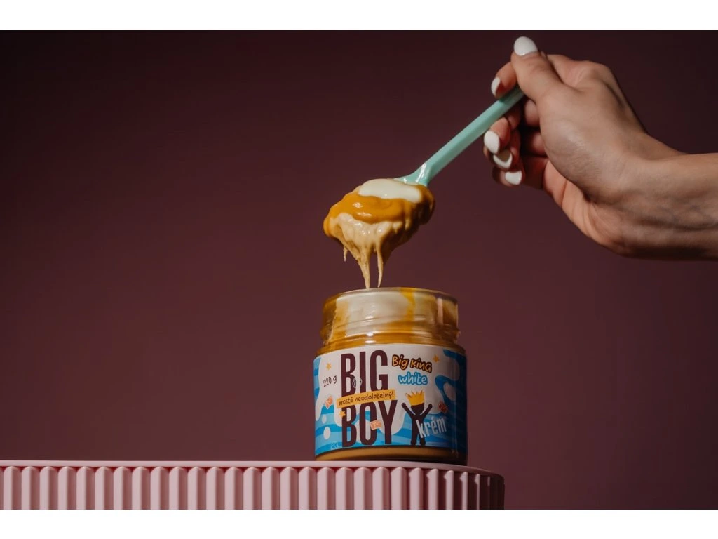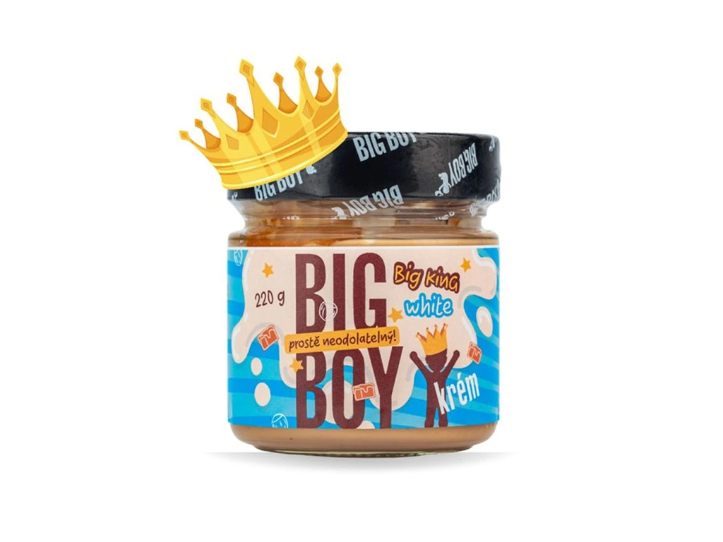 Že král musí být jen čokoládový? Kdepak! Big King White je jeho slavný bratříček, který místo kakaa oblékl mléčný plášť a vtrhl do království s lískovými oříšky, mléčnou jemností a pořádnou dávkou karamelu. Stejně krémový, stejně mazlivý, jen tentokrát bez kakaa. Ale pozor – o chuťovou korunu rozhodně nepřišel! Nebezpečně návykový. Na toast, do kaše… anebo rovnou na lžičku. My se neptáme. V každém království je jen jeden Big King… ale tenhle si řekl, že kakao není všechno. Oblékl si modrý plášť a přihodil pořádnou hrst lískových oříšků, nechal se jemně pohladit mlékem a decentně polaskat karamelem. A výsledek? Krém, kterému padneš k nohám. Big King White je bratříček slavného Big Kinga s kakaem, ale jde si svou cestou. Žádné tmavé tóny, žádné kakao. Tady vládne krémová lehkost, sametová struktura a sladkost, která tě obejme při každém soustu. Oříšky? Pražené do zlatova, přímo z Itálie. Mléko? Jemné, hebké, co se rozplývá na jazyku. A karamel? Ten tu není jen na okrasu – je to sladký šepot, co dělá z každé lžičky malý zážitek. Tahle koruna sedí komukoliv – milovníkům snídaňových toastů, kaší, palačinek, i těm, kteří krémy zásadně vyjídají po večerech přímo ze skleničky. A víš co? My jsme s tím úplně v pohodě. Big Boy® krémy si totiž užíváš tak, jak chceš ty. Big King White – když kakao odloží korunu a zazáří mléčnou jemností. Použití: Před konzumací promíchejte. Nadměrná konzumace může vyvolat projímavé účinky. Tabulka nutričních hodnot: 100 g Energetická hodnota 2259 kJ/543 kcal Tuky 35 g - z toho nasycené mastné kyseliny 6,7 g Sacharidy 43 g - z toho cukry 37 g Vláknina 3,7 g Bílkoviny 13 g Sůl 0,22 g Složení: Lískové ořechy pražené (Itálie) 41,6 %, třtinový cukr, krém s příchutí mléka se sladidlem (směs rostlinných tuků a olejů: slunečnicový olej, kokosový olej, kakaové máslo, olej světlice barvířské, sladidlo: maltitol, syrovátková směs, sušené odstředěné mléko, slunečnicový lecitin, vanilin), mléko sušené odstředěné 10,01 %, karamel se solí 10 % (cukr, smetana, jedlá sůl). Může obsahovat stopy ostatních skořápkových plodů a arašídů. Upozornění:Chraňte před teplem a přímým slunečním zářením. Po otevření spotřebujte do dvou měsíců.Dodatočné parametre