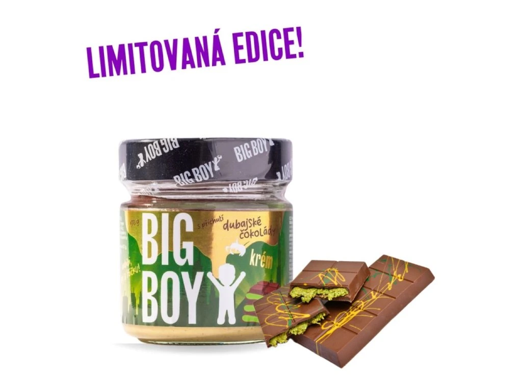 Hedvábně jemný pistáciový krém s křupavými kuličkami a bohatou vrstvou čokolády. Inspirovali jsme se fenoménem dubaiské čokolády, ale vylepšili jsme ho po svém! Limitovaná edice – jakmile zmizí, je pryč! Ulov si svůj pohár luxusu, než bude pozdě! Jestli něco umí Dubaj dokonale, pak je to spojení luxusu a dokonalých chutí. A právě tímto fenoménem jsme se inspirovali! Naše verze dubaiské čokolády však dostala BIG BOY vylepšení – místo tradičního kadaifu jsme do hedvábně jemného pistáciového krému přidali křupavé kuličky , které mu dodávají neodolatelnou texturu. A protože víme, že čokoláda a pistácie patří k sobě, korunovali jsme tento skvost bohatou vrstvou čokolády, která se při každém soustu rozplývá na jazyku. Výsledek? Lžička čistého potěšení , která vás přenese přímo do světa arabských delikates. LIMITOVANÁ EDICE – naposledy a nikdy více! Tento klenot mezi krémy vznikl jen na omezený čas a nebude se už nikdy vyrábět . Tak si ho nenechte utéct – jakmile zmizí, je navždy pryč! Ulovi si svůj pohár luxusu, než bude pozdě! Použití: Určeno k přímé spotřebě. Nadměrná konzumace může vyvolat projímavé účinky. Tabulka nutričních hodnot: 100 g Energetická hodnota 2276 kJ/550 kcal Tuky 43 g z toho nasycené mastné kyseliny 17 g Sacharidy 31 g z toho cukry 5,9 g Vláknina 6,7 g Bílkoviny 15 g Sůl 0,10 g Složení: Proteinový krém s mléčnou příchutí se sladidlem 55 % (směs rostlinných tuků a olejů: slunečnicový olej, kokosový olej, kakaové máslo, olej světlice barvířské, sladidlo: maltitol, syrovátková směs, sušené odstředěné mléko, slunečnicový lecitin, vanilin), pistácie jádra pražená mletá 30 %, mléčná čokoláda se sladidlem (sladidlo: maltitol, kakaové máslo, plnotučné sušené mléko, kakaová hmota, odtučněný kakaový prášek, emulgátor: lecitiny, aroma), extrudované rýžové kuličky (rýžová mouka 98,5 %, mono a diglyceridy mastných kyselin z řepkového oleje). Může obsahovat stopy ostatních skořápkových plodů. Upozornění:Skladujte v suchu a nevystavujte přímému slunečnímu záření. Chraňte před teplem. Po otevření spotřebujte do dvou měsíců.Dodatočné parametre