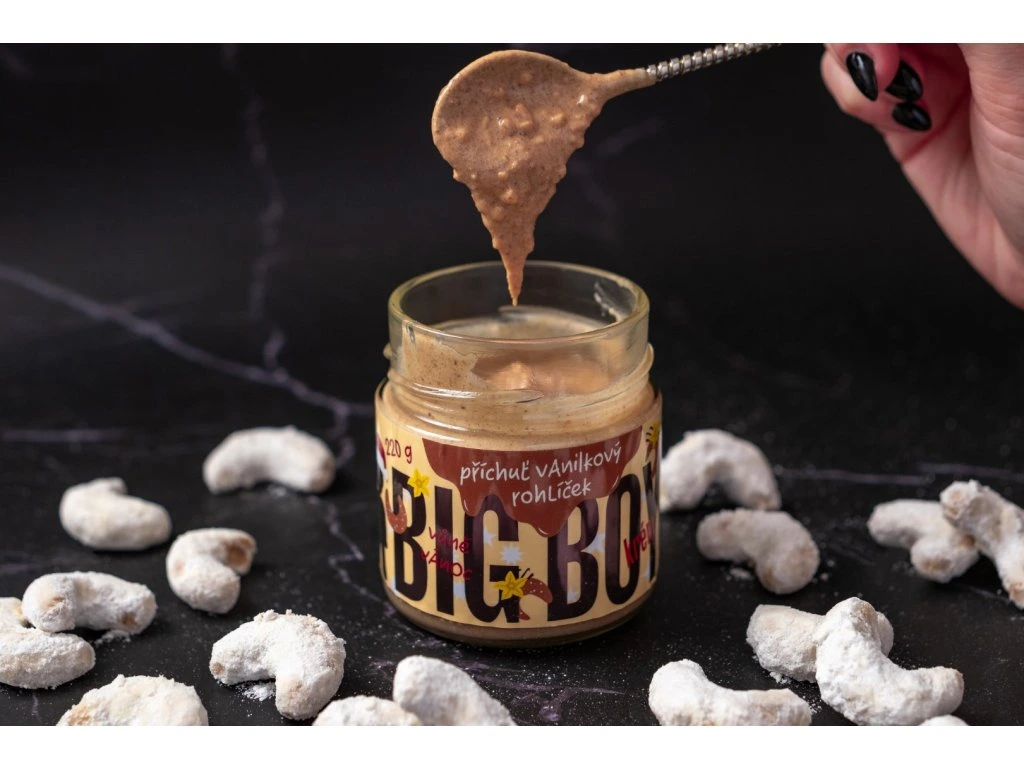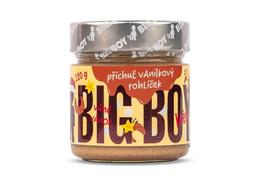Když se tě zeptáme, co je tvoje nejoblíbenější vánoční cukroví, bez přemýšlení vystřelíš odpověď ‚No přece vanilkové rohlíčky!‘? Pak se připrav na skutečnou vánoční nostalgii a sváteční náladu, kterou ti vykouzlí letošní vánoční novinka od BIG BOYe. Stejně jako vloni Vaječňák, krémová dobrota jménem Vanilkový rohlíček má aspirace na trhání rekordů. Počkej, až ji ochutnáš! Použití: Určeno k přímé spotřebě. Případná separace oleje na povrchu není na závadu, jedná se o přirozený jev. Před konzumací promíchejte. Tabulka nutričních hodnot: 100 g Energetická hodnota 2417 kJ/582 kcal Tuky 42 g - z toho nasycené mastné kyseliny 10 g Sacharidy 36 g - z toho cukry 30 g Vláknina 4 g Bílkoviny 14 g Sůl 0,06 g Složení: Arašídy pražené 21,7 %, vlašské ořechy mleté 19 %, cukr třtinový, lískové ořechy mleté, přepuštěné máslo ghí, mléko sušené odstředěné, kokosový cukr, přírodní vanilkové aroma 1,9 %. Může obsahovat stopy ostatních skořápkových plodů. Upozornění:Uchovávejte při teplotě do 25 °C, v suchu a nevystavujte přímému slunečnímu záření. Po otevření spotřebujte do dvou měsíců.Dodatočné parametre