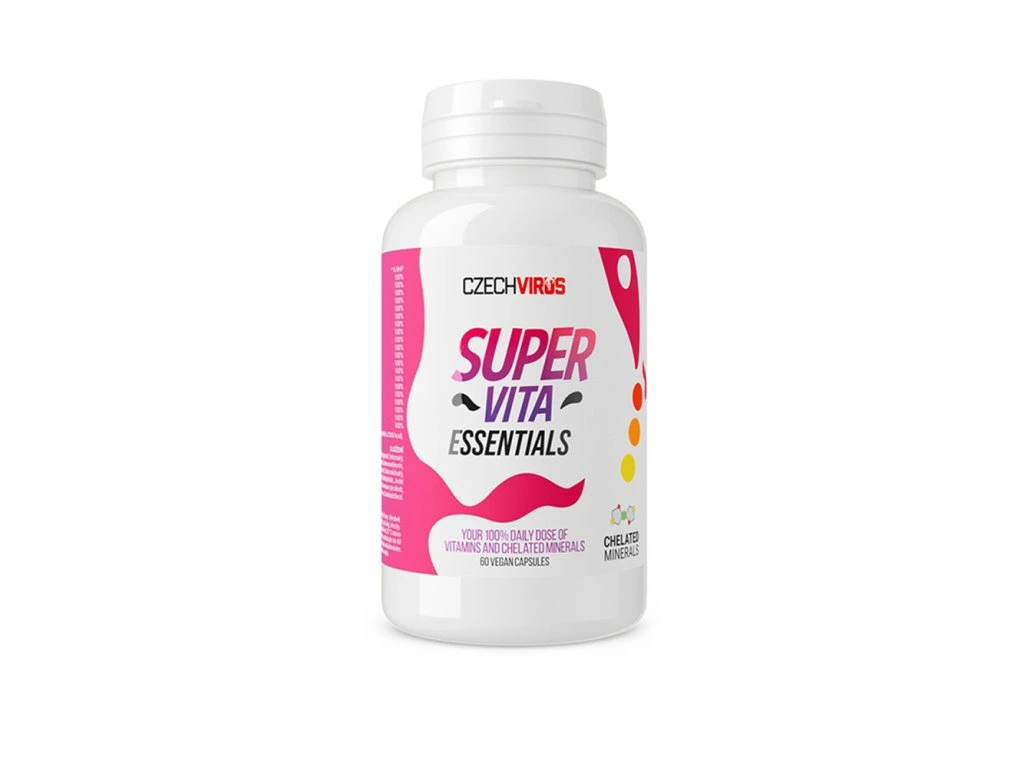 SuperVita Essentials je základní multivitaminový a multiminerální komplex od Czech Virus, navržený pro každodenní podporu zdraví. Bez kompromisů na kvalitě, bez zbytečných příslibů. Vhodný pro ty, kteří chtějí pokrýt esenciální potřeby organismu, ale nepotřebují pokročilé dávky jako u SuperVita PRO V2.0. V každé dávce najdeš Základ bez kompromisů. Nic navíc, jen vitamíny a minerály v těch nejlepších formách. 13 základních vitamínů: v bioaktivních formách, které tělo umí okamžitě využít 7 minerálů: přičemž klíčové jsou v chelátových vazbách – tedy v podobě, která je pro tělo maximálně vstřebatelná a šetrná k trávicímu traktu. Chelátové formy minerálů (např. bisglycináty) jsou navázány na aminokyseliny a tělo je přijímá přirozeněji, podobně jako ze stravy. Hlavní výhody SuperVity Essentials Základní, ale kvalitní podpora imunitního systému, energie, vitality, zdraví kostí a kognitivních funkcí. Veganské kapsle – vhodné i pro ty, kdo se vyhýbají živočišným složkám. Ideální volba pro běžné uživatele a sportovce na začátku cesty. Jaký je rozdíl mezi SuperVitou Essentials a PRO V2.0 PRO verze je určena pro pokročilé uživatele a sportovce, kteří chtějí extra dávku mikronutrientů. Obsahuje tekutou formu vitamínů a minerálů pro vyšší vstřebatelnost a účinnost. Lehčí dávkování – ideální pro ty, kteří chtějí mít dávky přesně pod kontrolou. Perfektní při náročném tréninkovém režimu a zvýšených nárocích na tělo. SuperVita Essentials je tedy skvělou volbou pro každodenní péči, zatímco SuperVita PRO V2.0 posune hranice výkonu ještě dál. Není třeba kombinovat, stačí si vybrat. Doporučené dávkování: užijte 1 kapsli kdykoliv během dne a zapijte ji dostatečným množstvím vody Tabulka nutričních hodnot: Vitamín A 800 mcg 100,00 % Vitamín B1 1,1 mg 100,00 % Vitamín B2 1,4 mg 100,00 % Vitamín B3 16 mg 100,00 % Vitamín B5 6 mg 100,00 % Vitamín B6 1,4 mg 100,00 % Biotin 50 mcg 100,00 % Vitamín B9 200 mcg 100,00 % Vitamín B12 2,5 mcg 100,00 % Vitamín C 80 mg 100,00 % Vitamín D3 5 mcg 100,00 % Vitamín E 12 mg 100,00 % Vitamín K2 75 mcg 100,00 % Zinek 10 mg 100,00 % Železo 70 mg 100,00 % Mangan 2 mg 100,00 % Měď 1 mg 100,00 % Jód 150 mcg 100,00 % Selen 55 mcg 100,00 % Chrom 33 mcg 100,00 % RHP - referenční hodnota příjmu (dříve doporučená denní dávka) Složení: Veganská kapsle HPMC, Kyselina L-askorbová, Bisglycinát železnatý, Glukonát zinečnatý, D-alfa-tokoferolacetát, Nikotinamid, Selenomethionin, Citrát manganatý, Menachinon, Panthothenhan vápenatý, Citrát měďnatý, Riboflavin, Pyridoxal-5-fosfát, Thiamin mononitrát, Methylfolát, Jodid draselný (anorganická forma), Retinol-acetát, D-biotin, Chromium picolinát, Methylcobalamin, Cholekalciferol. Upozornění:Uchovejte mimo dosah dětí. Výrobek není určen pro děti, těhotné a kojící ženy. Výrobek vyroben v závodě zpracovávajícím mléko, vajíčka, sojové boby, korýše, rybí olej, ořechy. Neobsahuje látky dopingového charakteru. Skladujte v suchu při teplotě do 25 °C mimo dosah přímého slunečního záření. Chraňte před mrazem. Po otevření spotřebujte do 60 dnů. Výrobce neručí za případné škody vzniklé nevhodným použitím nebo skladováním. Není určeno jako náhrada pestré a vyvážené stravy a zdravého životního stylu. Před užíváním se poraďte se svým ošetřujícím lékařem. Vyrobeno v ČR.Jedná se o doplněk stravy.