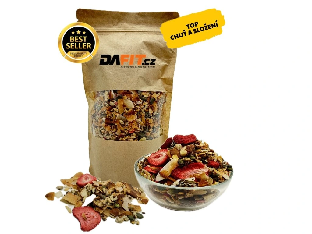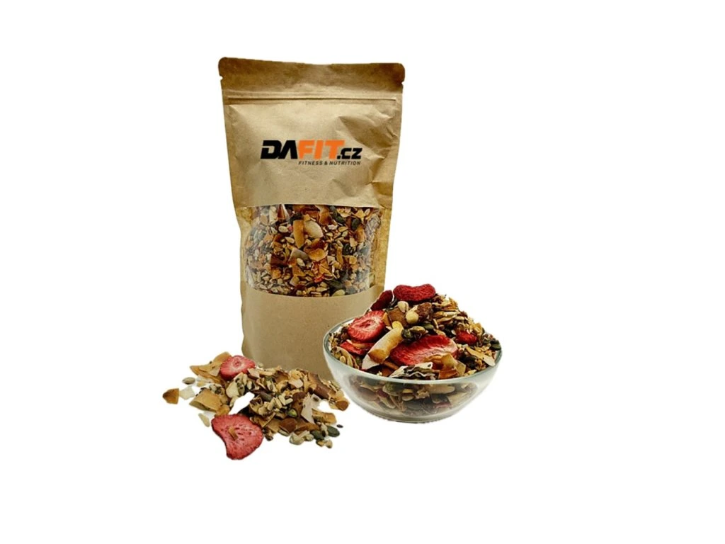 Zapečená směs olejnatých semen, kokosu a mandlí. Tabulka nutričních hodnot: 100 g Energetická hodnota 2318 kJ/554 kcal Tuky 48,1 g -z toho nasycené mastné tuky 20 g Sacharidy 10,2 g -z toho cukry 8,1 g Vláknina 13,8 g Bílkoviny 15,3 g Sůl 0,40 g Složení: Směs olejnatých semen v různém poměru 35 % (semena slunečnice loupená, semena tykev loupaná, lněná semínka, chia semínka (Salvia Hispanica)), kokosové chipsy, jádra mandlí, čekankový sirup, jahody sušené mrazem, jedlá sůl. Upozornění pro alergiky: obsahuje mandle. Může obsahovat stopy ostatních skořápkových plodů. Země původu: ČR Upozornění: Uchvávejte při teplotě do 25 °C, v suchu a nevystavujte přímému slunečnímu záření. Po otevření spotřebujte do 14 dnů.Dodatočné parametre