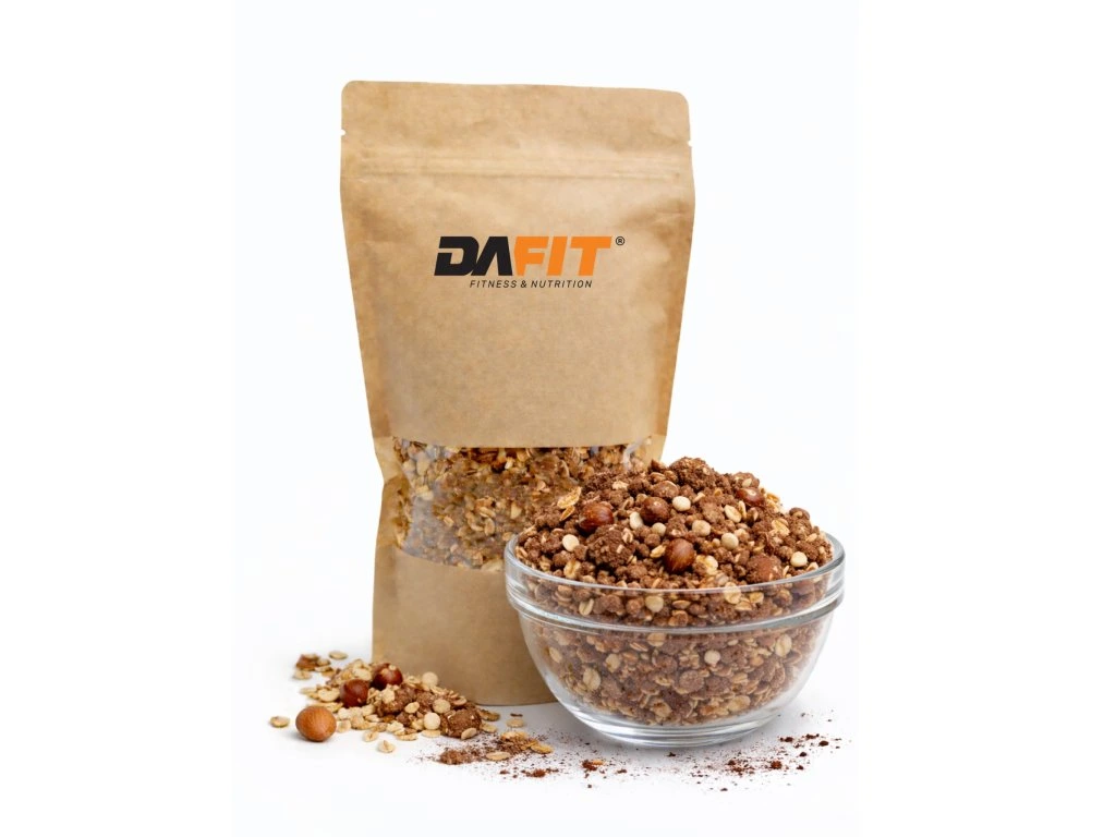 Zapečené směs ovesných vloček, ořechů s proteinem. Tabulka nutričních hodnot: 100 g Energetická hodnota 1878kJ/449 kcal Tuky 21 g - z toho nasycené mastné kyseliny 4 g Sacharidy 39,5 g - z toho cukry 6,8 g Vláknina 23,5 g Bílkoviny 11 g Sůl 0,10 g Složení: 40% ovesné vločky bezlepkové, oligofruktóza, 18% lískové ořechy, 8% protein (syrovátkový koncentrát), rýžové kuličky (rýžová mouka), 5% hořká čokoláda (cukr, kakaové máslo, kakaová hmota, sójový lecitin, vanilka bourbon), kakao, sůl. Upozornění pro alergiky: obsahuje lískové ořechy. Může obsahovat stopy ostatních skořápkových plodů. Země původu: ČR Upozornění: Uchvávejte při teplotě do 25 °C, v suchu a nevystavujte přímému slunečnímu záření. Po otevření spotřebujte do 14 dnů.Dodatočné parametre