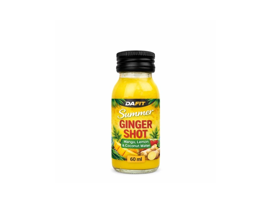 DAFTI Summer Ginger Shot – Zázvor, Mango, Citron, Kokos (60 ml) Dodejte svému dni energii a svěží chuť s funkčním shotem DAFIT Summer Ginger Shot. Kombinace výrazného zázvoru, sladkého manga, osvěžujícího citronu a jemné kokosové vody vytváří lahodný nápoj, který je ideální jako rychlé nakopnutí kdykoliv během dne. Tento praktický 60ml shot je skvělou volbou pro aktivní životní styl – snadno ho vezmete s sebou do práce, na trénink i na cesty. Intenzivní chuť a pečlivě vybrané ingredience z něj dělají perfektní doplněk každodenní rutiny. Proč pít ginger shot denně – hlavně v létě Podpora imunity - Zázvor a citron jsou tradičně spojovány s podporou obranyschopnosti. V létě pomáhá tělu zvládat změny teplot (klimatizace, cestování, festivaly, sport). Rychlá energie a osvěžení - Malý shot dodá okamžitý „fresh boost“ – ideální při únavě z horka, po tréninku nebo během náročného dne. Hydratace a doplnění tekutin - V létě se více potíme › tělo potřebuje pravidelně doplňovat tekutiny. Shot je praktický způsob, jak hydrataci zpestřit. Podpora trávení a metabolismu - Zázvor je známý tím, že může pomoci nastartovat trávení a zmírnit pocit těžkosti po jídle – což se hodí při letních grilovačkách nebo cestování. Ideální pro aktivní životní styl - Skvělý před sportem, na túře, na kole nebo na dovolené – malé balení se vejde kamkoliv. Pomoc při únavě z horka - Osvěžující kombinace tropického ovoce a citronu pomáhá „probudit“ tělo i mysl během dusných dnů. Kdy je nejlepší shot pít? ráno na nastartování dne před nebo po tréninku během cestování kdykoliv při únavě nebo přehřátí Hlavní benefity: výrazná a osvěžující chuť zázvoru a tropického ovoce praktické balení 60 ml – ready to drink ideální před tréninkem, během dne nebo na cestách kombinace exotických ingrediencí pro maximální chuťový zážitek Doporučené použití: ráno na nastartování dne před nebo po tréninku během cestování kdykoliv při únavě nebo přehřátí Doporučené dávkování: 1-3x 60 ml za den před konzumací protřepejte Tabulka nutričních hodnot: 100 ml Energetická hodnota 183,7 kJ/43,9 kcal Vitamíny B1, B2, A, E, C Tuky 0,08 g Sacharidy 8,75 g - z toho cukry 6,34 g Bílkoviny 0,9 g Složení: Zázvorová šťáva + zázvorový výluh 30 %, zázvorová šťáva + zázvorový macerát 30 %, citrónová šťáva 14,28 %, mango šťáva 14,28 %, kokosová voda 6,78 %, med 4,44 %, kurkuma 0,12 %, kampotský pepř 0,10 %. Upozornění: Chraňte před mrazem a přímým slunečním zářením. Skladujte v suchu při teplotě do 25°C. Výrobce neručí za škody vzniklé nevhodným použitím nebo skladováním. Nepřekračujte doporučenou denní dávku. Výrobek je pasterován. Po otevření spotřebujte do 7 dní.Dodatočné parametre