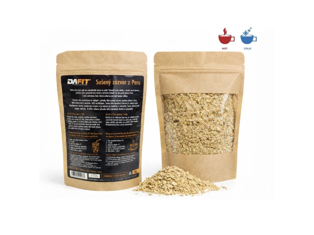 Našim cílem bylo najít ten nejkvalitnější zázvor na světě. Testovali jsme odrůdy z různých koutů planety, přičemž jsme zpracovali tuny zázvoru, než jsme narazili na ten pravý zázvor z Peru. S jeho jedinečnou chutí, která je silná se stal naší jasnou volbou. Chceme vám poskytnout to nejlepší z přírody. Náš sušený zázvor pochází přímo z Peru, kde je pěstován v souladu s BIO certifikátem. Znáte jeho benefity? Zázvor je známý svými detoxikačními účinky, podporuje trávení a je bohatý na vitamíny a minerály. Tento zázvor je tedy nejen zdravý, ale díky svému původu také vyjímečně chutný a aromatický. Zázvor z Peru jaro / léto Vstupte do světa osvěžení s naším zázvorem z Peru pro výrobu ICE TEA. Tento vysoce kvalitní sypaný zázvor je skvělou volbou pro všechny, kteří hledají zdravý a osvěžující nápoj pro horké letní dny. Ať už relaxujete u bazénu nebo hostíte grilovací párty s přáteli, tento BIO zázvor přinese do vašeho dne energii a svěžest. Zázvor z Peru podzim / zima Myslíte si, že máte po ruce vše, co potřebujete na přežití mrazivých zimních dnů? Co takhle něco, co vaše tělo nejen zahřeje, ale také mu poskytne zdravé benefity? Představujeme Vám sušený zázvor z Peru! Recept na domácí osvěžující ICE TEA (2 g na 2 dcl) na přípravu 1l ICE TEA budeme potřebovat: 1. 10 g sušeného zázvoru z Peru 2. 1l vody 3. skleněný džbán 1l 4. druhá nádoba na pčecedění 5. sítko na přecedění (cedník) 6. 20 ml citronové šťávy 7. 20 g medu / cukru Postup na výrobu 1l osvěžujícího zázvorového ICE TEA: 1. Do skleněného džbánu nasypeme 10 g sušeného zázvoru. 2. Zalijeme horkou vodou a necháme louhovat 5 minut. 3. Po 5ti minutách louhování pčecedíme čaj do druhé nádoby. 4. Dáme vychladit do lednice. 5. Po vychlazení opět přelejeme do skleněného džbánu a dochutíme medem (cukrem) cca 20 g/ l a citronovou šťávou cca 20 ml/ l nebo podle chuti. 6. Přidáme led a můžeme podávat. Podávat vždy vychlazené. Recept na zázvorový čaj, který Vás zahřeje (2 g na 2dcl) na přípravu 1l zázvorového čaje budeme potřebovat: 1. 10 g sušeného zázvoru z Peru 2. 1 l vody 3. Skleněný džbán 1 l 4. Druhá nádoba na přecedění 5. Sítko na přecedění (cedník). 6. 20 g medu / cukru Postup na výobu 1 l zázvorového čaje, který v zimě zahřeje: 1. Do skleněného džbánu nasypeme 10 g sušeného zázvoru. 2. Zalijeme horkou vodou a necháme louhovat 5 minut. 3. Po 5ti minutách louhování přecedíme čaj do druhé nádoby. 4. Po přecedění dochutíme medem (cukrem) cca 20 g / l nebo podle chuti. 5. Podáváme vždy teplé. Složení: 100 % zázvoru z Peru (drcený, sušený). Upozornění: Uchovávejte mimo dosah dětí. Skladujte na suchém a chledném místě, mimo dosah slunečního záření.Dodatočné parametre