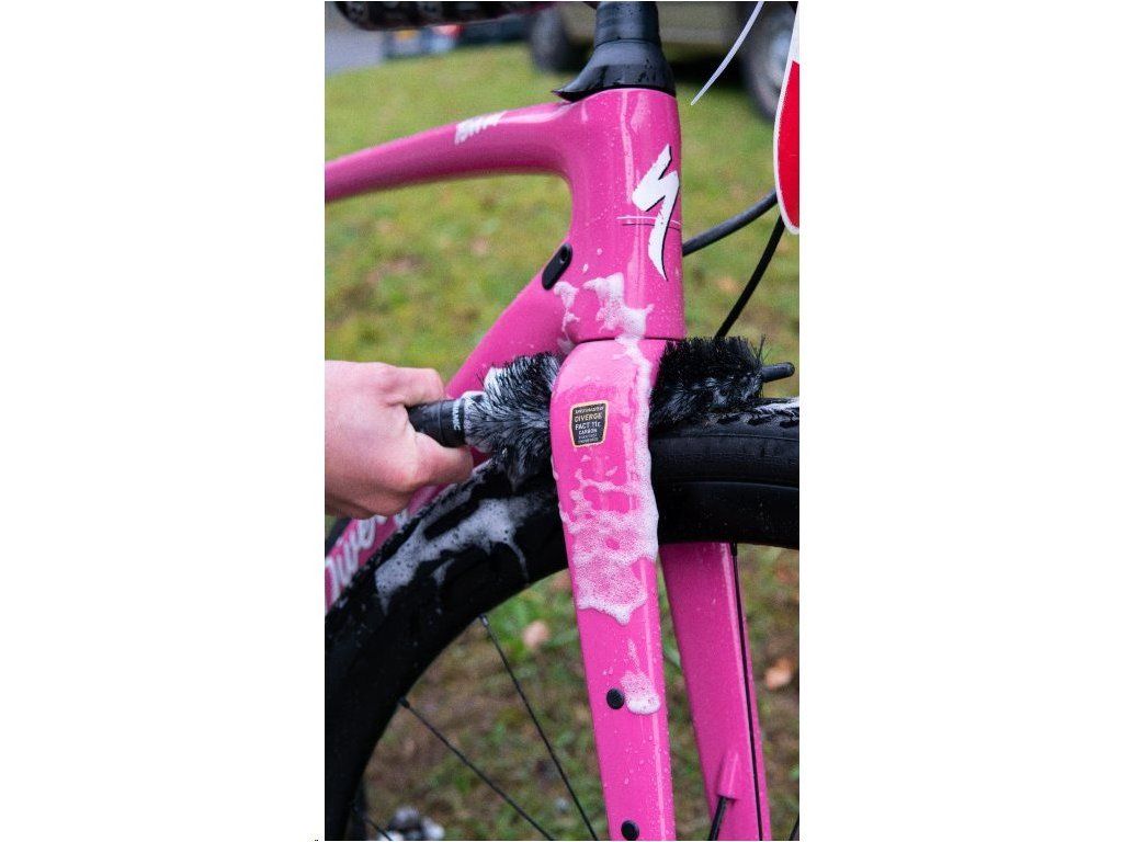 Naplňte vedro vodou (ideálne teplou) a penovým čistiacim prostriedkom, napríklad Badass Bubbles. Pred použitím sa uistite, že je kefa na kolesá a komponenty mokrá, aby ste vyčistili všetky nečistoty z bicykla. Vykonávate rýchle čistenie? Naneste na bicykel prípravok Dirt Destroy a nechajte ho pôsobiť približne 2 až 3 minúty. Vyčistite kolesá a komponenty kefou a potom ich opláchnite vodou alebo utrite čistou a suchou leštiacou handričkou z mikrovlákna.