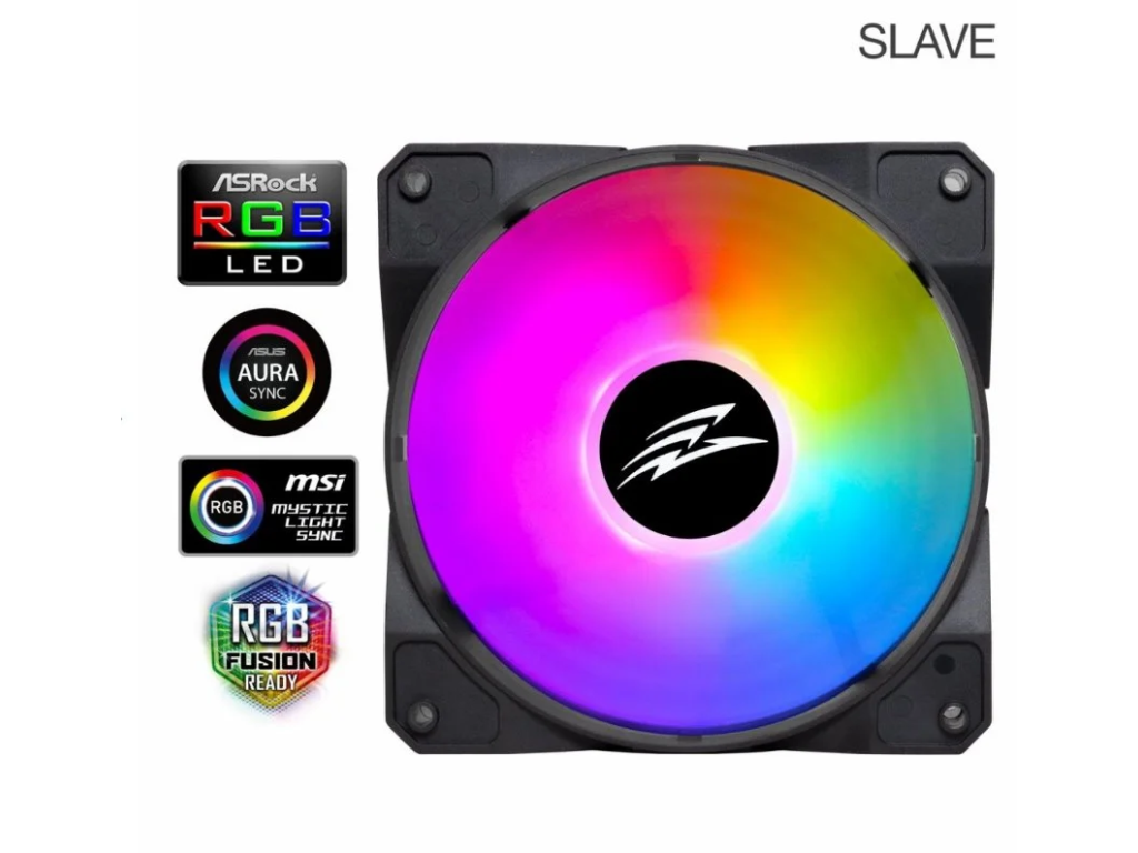 EVOLVEO 12FS ventilátor 120mm, ARGB, čierny rám, slaveARGB LED dúhový ventilátor s LED diódami. Ventilátor umožňuje zobraziť všetkých sedem farieb dúhového spektra naraz. Ide o riadiaci ventilátor, ktorý je určený na použitie s ventilátorom EVOLVEO 12FM. Osvetlenie LED sa ovláda pomocou tlačidla reset alebo tlačidla LED na ovládacom paneli skrine alebo pripojením dodaného kábla ARGB k základnej doske.
