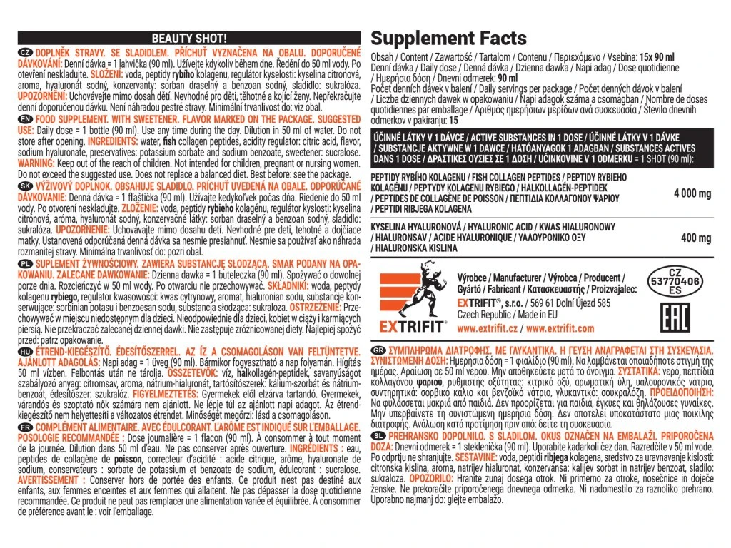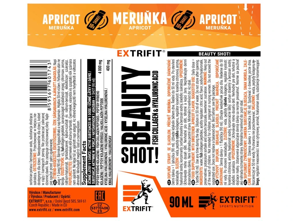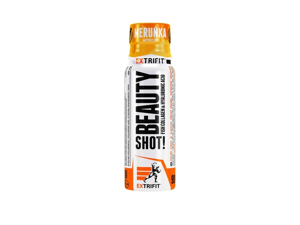 Péče o vzhled bývá náročná. S doplňkem BEAUTY SHOT! je to otázka pár vteřin. Prémiové kolagenní peptidy VERISOL® z mořských ryb a 400 mg kyseliny hyaluronové. Kombinace, kterou oceňují lidé pečující o vizáž do detailu – od každodenní skincare rutiny až po soutěžní formu. Mimořádně účinné duo: značkové kolagenní peptidy VERISOL® s vysokou biologickou dostupností a kyselina hyaluronová. Minimalistické složení, lahodná chuť a pohodlné dávkování. Hodí se ráno, po tréninku i večer – přesně podle tvého režimu. Díky tekuté formě tělo aktivní látky vstřebá rychle a efektivně. Proč si BEAUTY SHOT! vybereš i ty: 4 000 mg kolagenních peptidů VERISOL® – klinicky ověřená dávka pro maximální účinek. 400 mg kyseliny hyaluronové – až 4× větší množství v porovnání s běžnými produkty! Vezmeš kamkoli – do kapsy, kabelky nebo sportovní tašky. ?? Hotovo za pár vteřin – žádná příprava, žádné míchání. Protřep, otevři, vypij. Jak ho zařadit? 1× denně kdykoli. Hodí se ráno, do práce, po tréninku i večer. Pro jemnější chuť nařeď do 50 ml vody. Pro koho Ideální pro ženy i muže. Od běžného dne v kanceláři až po soutěžní scénu. Zkrátka pro každého, kdo chce péči o vzhled řešit rychle, snadno a chutně. Shoty EXTRIFIT® – česká výroba Naše shoty vyrábíme pod jednou střechou v Dolním Újezdě: vlastní vývoj, vlastní technologie, naše odpovědnost za každý mililitr. Celý proces držíme pevně v rukou – od výběru těch nejlepších surovin, přes testování a míchání, až po balení a expedici. Každou šarži si hlídáme sami. Žádné anonymní fabriky, žádný outsourcing. Jen precizní výroba a výsledek, na který se můžeš spolehnout. Doporučené dávkování: Denní dávka = 1 lahvička (90 ml). Užívejte kdykoliv během dne. Ředění do 50 ml vody Po otevření neskladujte Tabulka nutričních hodnot: Obsah účinných látek: 1 lahvička (90 ml) Peptidy rybího kolagenu 4000 mg Kyselina hyaluronová 400 mg Složení: Voda, peptidy rybího kolagenu, regulátor kyselosti: kyselina citrónová, aroma, hyaluronát sodný, konzervanty: sorban draselný a benzoan sodný, sladidlo: sukralóza. Balení: 90 ml / 15 x 90 ml Upozornění: Uchovávejte mimo dosah dětí. Nevhodné pro děti, těhotné a kojící ženy. Nepřekračujte denní doporučenou dávku. Není náhradou pestré stravy. Minimální trvanlivost do: viz. obal.Jedná se o doplněk stravy.