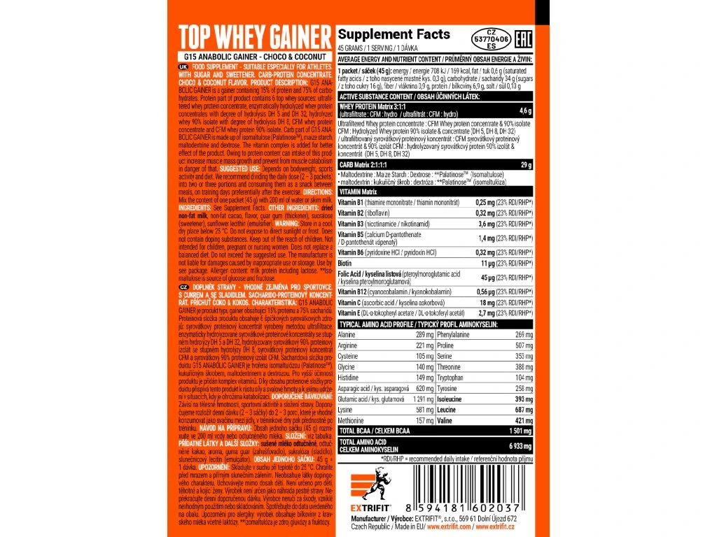 Jedná se o unikátní produkt pro zvyšování váhy! G 15 Gainer není jen jedním z řady běžných gainerů! Proteinová složka G 15 obsahuje 6 špičkových syrovátkových zdrojů, což je u výrobku typu gainer zcela ojedinělé: syrovátkový proteinový koncentrát vyrobený metodou ultrafiltrace enzymaticky hydrolyzovaný syrovátkový proteinový koncentrát se stupněm hydrolýzy DH5 enzymaticky hydrolyzovaný syrovátkový proteinový koncentrát se stupněm hydrolýzy DH32 enzymaticky hydrolyzovaný syrovátkový 90 % proteinový izolát se stupněm hydrolýzy DH8 syrovátkový proteinový koncentrát CFM syrovátkový 90% proteinový izolát CFM Proteiny pocházející ze syrovátky jsou do potréninkových produktů těmi nejvhodnějšími a nejúčinnějšími. Když připravovali recepturu tohoto nového produktu, nechtěli vytvořit jen obyčejný gainer. Chtěli Vám dát něco víc, něco, co má logiku, co dává smysl a co Vám skutečně pomůže při zvyšování hmotnosti. Nová G 15 opravdu funguje, a to i u cvičenců, kteří mají skutečný problém přibrat! Šest zdrojů bílkovin je to pravé! V G 15 jsou správně použity jak hydrolyzované, tedy rychle vstřebatelné syrovátkové proteiny, tak „tradiční“ koncentráty, dále špičky v proteinech - CFM koncentrát a CFM 90 % izolát. Výsledným efektem zvolené kombinace proteinů je účinný gainer se skvělou konzistencí a chutí. Sacharidová složka produktu G15 Whey je tvořena hned čtyřmi zdroji: isomaltulózou (palatinóza), moderním sportovním sacharidem, který Vám dá tolik energie jako cukr, ovšem uvolňuje se postupně a má velmi nízký GI (glykemický index) kukuřičným škrobem, vynikajícím komplexním polysacharidem maltodextrinem, tradičním oligosacharidem, velmi populárním ve sportovní výživě dextrózou, přírodním hroznovým cukrem Tedy G 15 Gainer disponuje vyváženou kombinací sacharidových zdrojů pro podporu regenerace po výkonu. Pro vyšší účinnost produktu je přidán komplex 10 vitamínů: vitamín B1 vitamín B2 vitamín B3 vitamín B5 vitamín B6 biotin kyselina listová vitamín B12 vitamín C vitamín E Dávky vitamínu však zde nejsou „jen pro oko“!, ale jsou obsaženy ve skutečně účinných dávkách, které jsou sestaveny logicky podle tabulek denních doporučených dávek! Ve 100 g výrobku naleznete celých 50 % denních doporučených dávek vitamínů! Díky obsahu proteinové složky produktu přispívá tento produkt k růstu síly a svalové hmoty a k jejímu udržení v situacích, kdy je ohrožena katabolizací. Doporučené dávkování: závisí na tělesné hmotnosti, sportovní aktivitě a složení stravy doporučujeme rozložit denní dávku (2 - 3 sáčky) do 2 - 3 porcí, které je vhodné konzumovat jako svačinu mezi jídly, v tréninkové dny pak přednostně po tréninku obsah jednoho sáčku (45 g) rozmixujte ve 200 ml vody nebo odtučněného mléka Tabulka nutričních hodnot: Průměrný obsah energie a živin: 100 g 45 g Energetická hodnota 1574 kJ / 375 kcal 708 kJ / 169 kcal Tuky 1,3 g 0,6 g - z toho nasycené mastné kyseliny 0,7 g 0,3 g Sacharidy 75 g 34 g - z toho cukry 34 g 16 g Vláknina 1,9 g 0,9 g Bílkoviny 15 g 6,9 g Sůl 0,29 g 0,13 g syrovátkový proteinový matrix 3:1:1 (ultrafiltrát:CFM:Hydro) 10,3 g 4,6 g ultrafiltrovaný syrovátkový proteinový koncentrát : CFM syrovátkový proteinový koncentrát a 90 % izolát CFM : hydrolyzovaný syrovátkový proteinový 90 % izolát a koncentrát (DH5, DH8, DH32) sacharidový matrix 2:1:1:1 64,5 g 29 g maltodextrin : kukuřičný škrob : dextróza : palatinóza (isomaltulóza) Přehled vitamínů: 100 g (% RHP) 45 g (% RHP) Vitamín B1 (thiamin mononitrát) 0,55 mg (50 %) 0,25 mg (23 %) Vitamín B2 (riboflavin) 0,7 mg (50 %) 0,32 mg (23 %) Vitamín B3 (niacinamid) 8 mg (50 %) 3,6 mg (23 %) Vitamín B5 (pantothenát vápenatý) 3 mg (50 %) 1,4 mg (23 %) Vitamín B6 (pyridoxin HCl) 0,7 mg (50 %) 0,32 mg (23 %) Biotin 25 mcg (50 %) 11 mcg (23 %) Kyselina listová 100 mcg (50 %) 45 mcf (23 %) Vitamín B12 0,0013 mg (50 %) 45 mcg (23 %) Vitamín C 40 mg (50 %) 18 mg (23 %) Vitamín E 6 mg (50 %) 2,7 mg (23 %) RHP = referenční hodnota příjmu (dříve doporučená denní dávka) Typický profil aminokyselin: 100 g 45 g Alanin 642 mg 289 mg Arginin 491 mg 221 mg Cystein 233 mg 105 mg Glycin 311 mg 140 mg Histidin 331 mg 149 mg Kyselina asparagová 1379 mg 620 mg Kyselina glutamová 2869 mg 1291 mg Lysin 1291 mg 581 mg Methionin 349 mg 157 mg Fenylalanin 597 mg 269 mg Prolin 1127 mg 507 mg Serin 785 mg 353 mg Threonin 863 mg 388 mg Tryptofan 231 mg 104 mg Tyrosin 574 mg 258 mg Isoleucin 872 mg 393 mg Leucin 1526 mg 687 mg Valin 936 mg 421 mg BCAA celkem 3 335 mg 1 501 mg Aminokyseliny celkem 15 406 mg 6 933 mg Složení: Čokoláda-kokos maltodextrin, kukuřičný škrob, dextróza, palatinóza (isomaltulóza), instantní syrovátkový proteinový koncentrát vyrobený metodou ultrafiltrace, enzymaticky hydrolyzovaný 90 % syrovátkový izolát se stupněm hydrolýzy DH8, enzymaticky hydrolyzovaný syrovátkový koncentrát se stupněm hydrolýzy DH5, enzymaticky hydrolyzovaný syrovátkový koncentrát se stupněm hydrolýzy DH32, instantní syrovátkový proteinový koncentrát vyrobený metodou CFM, instantní syrovátkový 90 % proteinový izolát vyrobený metodou CFM, vitamín C, vitamín B3, vitamín E, enzym Tolerase (pH stabilní laktáza), vitamín B5, vitamín B2, vitamín B6, vitamín B1, kyselina listová, biotin, vitamín B12 přídatné látky (sestupně): sušené mléko odtučněné, kakao odtučněné, aroma, guarová guma (stabilizátor, zahušťovadlo), sukralóza (sladidlo), slunečnicový lecitin (emulgátor) Upozornění: Skladujte v suchu při teplotě do 25 °C, pečlivě uzavřené. Po otevření spotřebujte do šesti měsíců. Chraňte před mrazem a přímým slunečním zářením. Neobsahuje látky dopingo