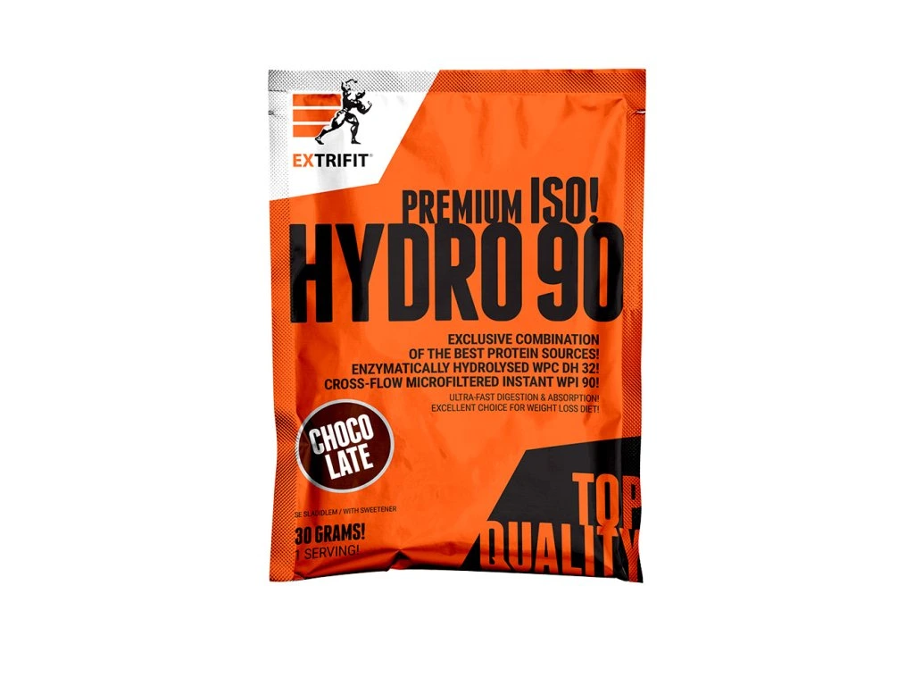 HYDRO ISOLATE 90 – NEKOMPROMISNÍ KVALITA PRO NÁROČNÉ SPORTOVCE. Když chcete to nejlepší, nesmíte dělat kompromisy. HYDRO ISOLATE 90 je vrchol mezi proteinovými suplementy – exkluzivní kombinace 90% CFM instantního syrovátkového izolátu a enzymaticky hydrolyzovaného syrovátkového koncentrátu s nejvyšším stupněm hydrolýzy DH 32! Tento prémiový protein je určen všem, kdo chtějí maximální čistotu, ultra rychlou vstřebatelnost a špičkové nutriční parametry bez zbytečných příměsí. Proč sáhnout po HYDRO ISOLATE 90? Maximální kvalita bílkovin – Obsahuje 90% syrovátkový izolát CFM a hydrolyzovaný syrovátkový koncentrát s DH 32, což zajišťuje nejrychlejší možné vstřebání a optimální využití pro svalový růst a regeneraci. Ultra rychlá stravitelnost – Díky vysokému stupni hydrolýzy je tento protein perfektní volbou po náročném tréninku nebo kdykoliv během dne, kdy potřebujete rychle doplnit kvalitní bílkoviny. Bez barviv a zahušťovadel – Nadstandardně čisté složení bez zbytečných aditiv. Minimální obsah cukrů a tuků – Pouze 0,4 g cukru a 0,6 g tuku na porci, což z HYDRO ISOLATE 90 dělá ideální protein i do redukční diety. Vysoký obsah BCAA a esenciálních aminokyselin – 5 500 mg BCAA a více než 25 000 mg aminokyselin v jedné dávce poskytují silnou podporu pro regeneraci a ochranu svalové hmoty. Pro koho je HYDRO ISOLATE 90 ideální? Siloví a výkonnostní sportovci – Ideální pro všechny, kdo chtějí maximální podporu svalového růstu, výkonu a regenerace. Nadšenci do fitness výživy – Perfektní volba pro ty, kteří hledají protein s minimem cukrů a tuků, aby podpořili svoji formu. Fajnšmekři v oblasti sportovní výživy – Pokud si potrpíte na nejvyšší možnou kvalitu a perfektní nutriční profil, HYDRO ISOLATE 90 vás nadchne! DOPŘEJTE SI ŠPIČKOVÝ PROTEIN BEZ KOMPROMISŮ HYDRO ISOLATE 90 je navržen pro ty, kteří chtějí to nejlepší, vynikající chuť a čisté složení. Vsaďte na kvalitu, kterou ocení vaše svaly i váš výkon! Proteiny EXTRIFIT® – česká výroba Naše proteiny vyrábíme pod jednou střechou v Dolním Újezdě: vlastní vývoj, vlastní technologie, naše odpovědnost za každý gram. Celý proces držíme pevně v rukou – od výběru těch nejlepších surovin, přes testování a míchání, až po balení a expedici. Každou šarži si hlídáme sami. Žádné anonymní fabriky, žádný outsourcing. Jen precizní výroba a výsledek, na který se tvoje svaly můžou spolehnout – ať jsi profík, nebo nováček. Doporučené dávkování: denní dávka = 1 sáček (30 g) rozmixujte obsah 1 sáčku (30 g) ve 200 ml vody Tabulka nutričních hodnot: Průměrný obsah energie a živin: 100 g 30 g Energetická hodnota 1564 kJ / 372 kcal 469 kJ / 112 kcal Tuky 2,0 g 0,6 g - z toho nasycené mastné kyseliny 0,7 g 0,2 g Sacharidy 3,3 g 1,0 g - z toho cukry 1,4 g 0,4 g Vláknina 0 g 0 g Bílkoviny 84 g 25 g Sůl 0,62 g 0,19 g Typický profil aminokyselin: 100 g 30 g Alanin 3 795 mg 1 139 mg Arginin 3 436 mg 1 031 mg Cystein 2 071 mg 621 mg Glycin 1 471 mh 441 mg Histidin 1 382 mg 415 mg Kyselina asparagová 9 117 mg 2 735 mg Kyselina glutamová 14 064 mg 4 219 mg Lysin 8 233 mg 2 470 mg Methionin 1 800 mg 540 mg Fenylalanin 2 449 mg 735 mg Prolin 4 728 mg 1 418 mg Serin 3 640 mg 1 092 mg Threonin 5 657 mg 1 697 mg Tryptofan 1 620 mg 486 mg Tyrosin 2 427 mg 728 mg Isoleucin 5 357 mg 1 607 mg Leucin 8 590 mg 2 577 mg Valin 4 390 mg 1 316 mg BCAA celkem 18 337 mg 5 500 mg Aminokyseliny celkem 84 227 mg 25 267 mg Složení: HYDRO-ISO MATRIX* 95 % (instantní syrovátkový proteinový izolát CFM**, enzymaticky hydrolyzovaný syrovátkový proteinový koncentrát DH 32), kakao se sníženým obsahem tuku (pouze příchuť čokoláda), L-arginin, aroma, sladidlo: sukralóza. *původ: EU **obsahuje emulgátor: slunečnicový lecitin 0,4 %. Upozornění: Skladujte v suchu při teplotě do 25 °C, pečlivě uzavřené. Po otevření spotřebujte do šesti měsíců. Chraňte před mrazem a přímým slunečním zářením. Uchovávejte mimo dosah dětí. Není určeno pro děti, těhotné a kojící ženy. Výrobek není určen jako náhrada pestré stravy. Nepřekračujte doporučenou denní dávku. Výrobce neručí za škody vzniklé nevhodným použitím nebo skladováním. Spotřebujte do data uvedeného na obalu. Upozornění pro alergiky: výrobek obsahuje bílkoviny z kravského mléka včetně laktózy.Jedná se o doplněk stravy.