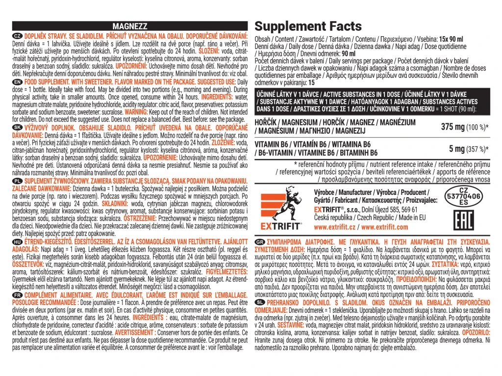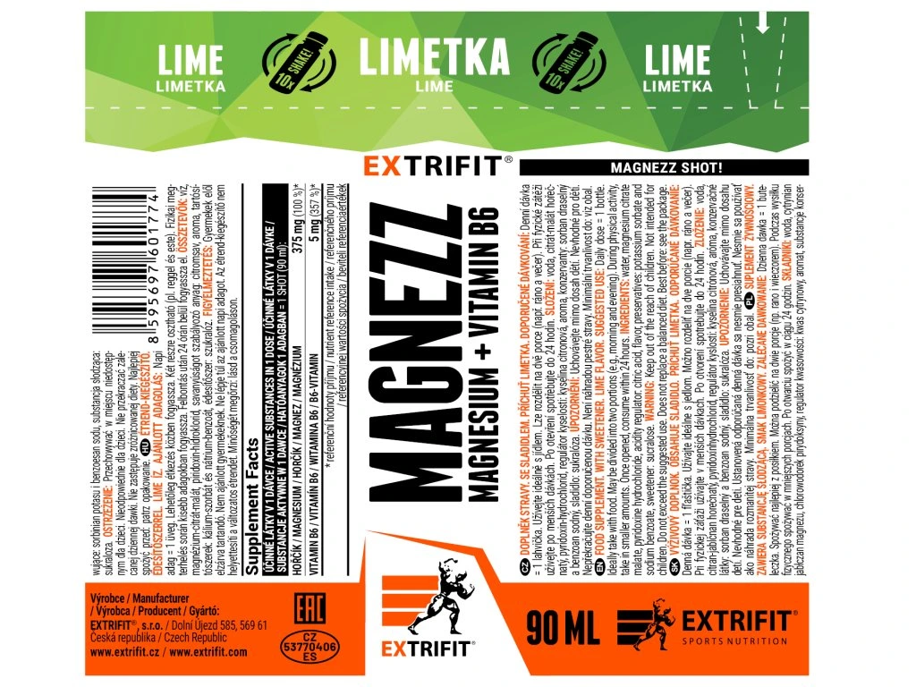 MAGNEZZ SHOT! (90 ml, 15 x 90 ml) Uklidni hlavu. Dobij se. Funguj. Malá lahvička, velký efekt. Vypij snadno 100 % denní dávky hořčíku v unikátní citrát-malátové formě. Obohaceno o vysokou dávku vitamínu B6 pro maximální efekt. Kapsle mají své místo, když ale potřebuješ okamžité řešení, sáhni po MAGNEZZ SHOT! Obsahuje organickou formu citrát-malát hořečnatý, která využívá to nejlepší z obou chelátů. K tomu připočti vysokou dávku vitamínu B6 a dostáváš ověřené kombo pro tvoji psychickou pohodu a dobře fungující svaly. Hoď si shot do kapsy a vypij, kdy se ti hodí. Nebo rozděl na dvě dávky – ráno a večer, ať jsi v pohodě celý den. Co získáš díky MAGNEZZ SHOT! Méně únavy, víc výkonu. Hořčík i B6 přispívají k energetickému metabolismu a ke snížení míry únavy a vyčerpání – přesně to, co chceš při tréninku, v práci i na cestách. Spolehlivé svaly. Hořčík podporuje činnost svalů a elektrolytickou rovnováhu. Lepší fokus, klidnější hlavu. Hořčík i B6 podpoří psychickou pohodu a nervy v klidu. Tělo, které drží. Hořčík přispívá ke zdraví kostí a zubů, B6 se účastní tvorby červených krvinek. Jak používat? Běžný den: 1 lahvička. Ideálně s jídlem. Chceš to rozdělit? Dej si polovinu ráno a polovinu večer. Stres v práci? Popíjej po menších dávkách v průběhu dne. Sportuješ? Dej si polovinu ráno a zbytek po zátěži pro zklidnění svalů. Shot nebo kapsle? Vyber si z toho nejlepšího. MAGNEZZ SHOT! – když chceš osvěžit a dodat hořčík okamžitě. Ideální, když jsi v pohybu a vyhovuje ti flexibilní dávkování – můžeš užívat celý shot najednou, nebo jak zrovna potřebuješ. MAGNESIUM CHELATE – když preferuješ pozvolnější nástup a žádnou chuť. Bisglycinátová forma je oblíbená pro šetrnost k zažívání a relaxační efekt. Dopřej si méně únavy a víc klidu na to podstatné s MAGNEZZ SHOT! – hořčík, co se přizpůsobí tobě. Bez šejkru, bez kompromisů a bez zapíjení. Doporučené dávkování: Denní dávka = 1 lahvička (90 ml). Užívejte ideálně s jídlem. Lze rozdělit na dvě porce (např. ráno a večer). Při fyzické zátěži užívejte po menších dávkách. Po otevření spotřebujte do 24 hodin. Tabulka nutričních hodnot: Obsah účinných látek: 1 lahvička (90 ml) Hořčík 375 mg (100 % RHP) Vitamín B6 5 mg (357 % RHP) RHP - referenční hodnota příjmu (dříve doporučená denní dávka) BALENÍ: 90 ml / 15x 90 ml Složení: Voda, citrát-malát hořečnatý, pyridoxin-hydrochlorid, regulátor kyselosti: kyselina citronová, aroma, konzervanty: sorban draselný a benzoan sodný, sladidlo: sukralóza. Upozornění:Uchovávejte mimo dosah dětí. Nevhodné pro děti. Nepřekračujte denní doporučenou dávku. Není náhradou pestré stravy. Minimální trvanlivost do: viz obal.Jedná se o doplněk stravy.