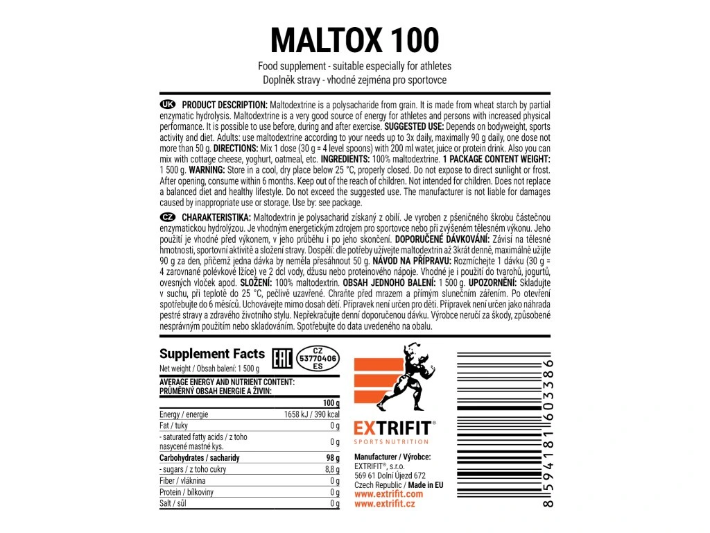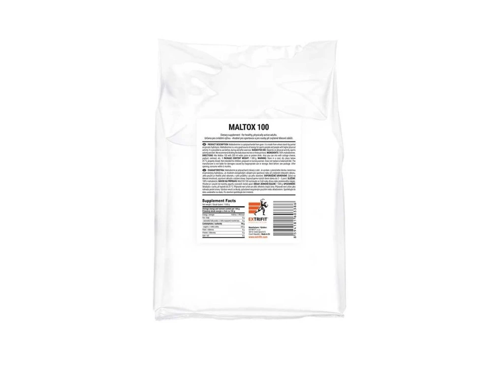 Maltodextrin je polysacharid získaný z obilí. Je vyroben z pšeničného škrobu částečnou enzymatickou hydrolýzou. Vzniká spojením pěti molekul glukózy – jednoduchého cukru sloužícího jako hlavní zdroj energie pro naše tělo. Výhodou tohoto spojení je možnost pozvolnějšího uvolňování glukózy jako zdroje energie. Maltodextrin se postupně štěpí v našem střevě na jednotlivé molekuly glukózy. Ty se pak plynule vstřebávají a zajišťují stabilní zvýšení hladiny krevního cukru (glykémie). Rychlé výkyvy hladiny krevního cukru způsobené jednorázovým příjmem většího množství jednoduchého cukru vedou ke střídání pocitu sytosti a hladu. Pro sportovce není takový způsob hrazení energie optimální. Dobrého efektu se docílí právě spojením několika molekul glukózy do krátkého řetězce – maltodextrinu. Jeho použití je vhodné před výkonem, v jeho průběhu i po jeho skončení. není sladký je okamžitě rozpustný díky aglomerizaci je vynikajícím zdrojem sacharidů pro sportovce a pro osoby při zvýšené tělesné zátěži Extrifit® Maltox 100 nepochází z Číny. Pšenice (surovina pro výrobu maltodextrinu) je vypěstována v zemích Evropské unie. Doporučené dávkování: závisí na tělesné hmotnosti, sportovní aktivitě a složení stravy doporučujeme rozložit denní dávku do 2 – 3 porcí Maltox 100 rozmixujte ve 200 ml vody, džusu nebo proteinového nápoje vhodné je použití do tvarohů, jogurtů, ovesných vloček apod. Tabulka nutričních hodnot: Průměrný obsah energie a živin: 100 g Energetická hodnota 1 658 kJ / 390 kcal Tuky 0 g - z toho nasycené mastné kyseliny 0 g Sacharidy 98 g - z toho cukry 8,8 g Vláknina 0 g Bílkoviny 0 g Sůl 0 g Složení: 100 % maltodextrin Upozornění: produkt je vhodný i pro sportovce na bezlepkové dietěJedná se o doplněk stravy.