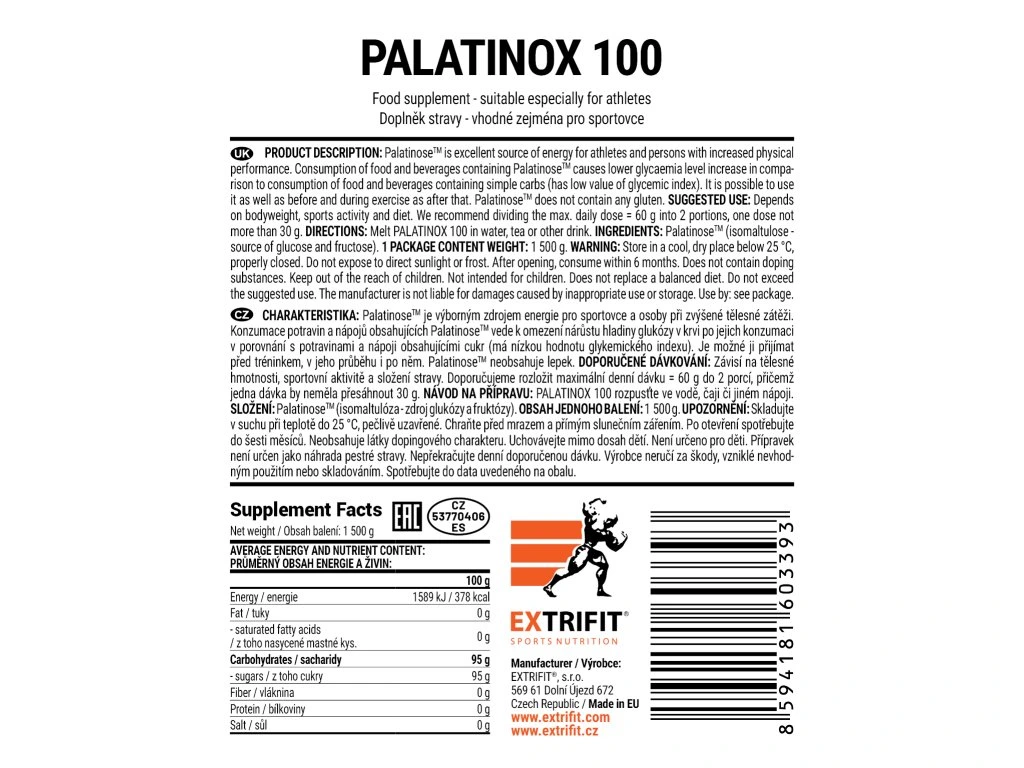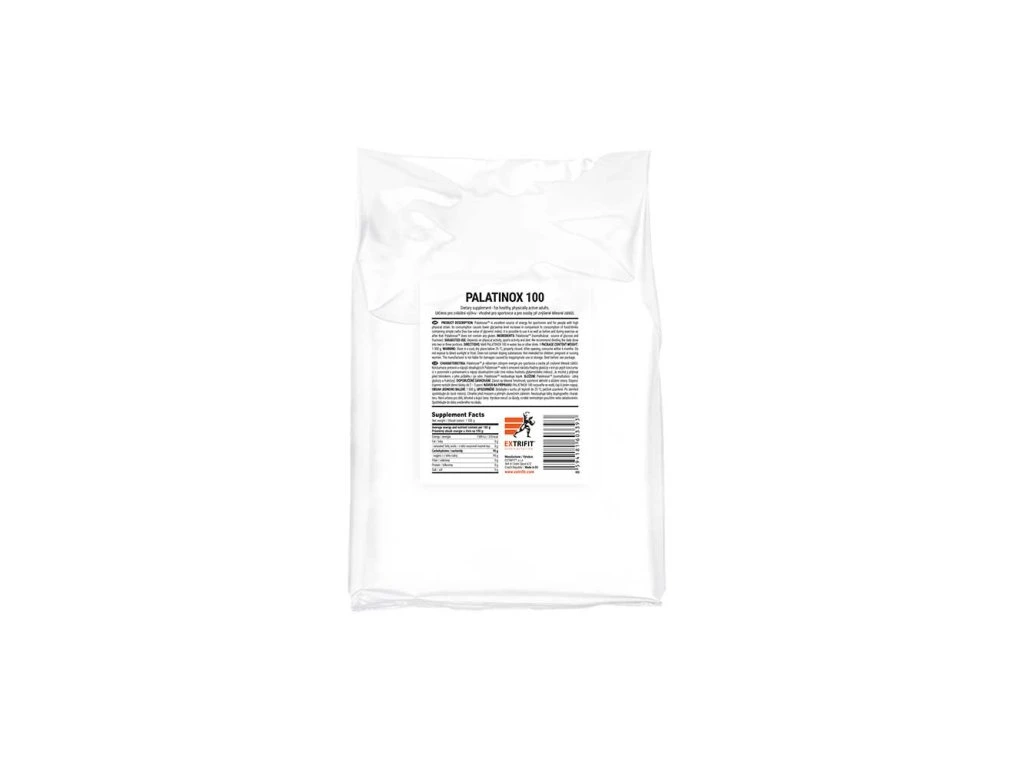 Palatinóza je výborným zdrojem energie pro sportovce a osoby při zvýšené tělesné zátěži. Konzumace potravin a nápojů obsahujících palatinózu vede k nižšímu nárůstu hladiny glukózy v krvi po jejich konzumaci v porovnání s potravinami a nápoji obsahujícími cukr (cukr má vyšší hodnotu glykemického indexu). Je možné ji přijímat před tréninkem, v jeho průběhu i po něm. Doporučené dávkování: Palatinox 100 užívejte v závislosti na tělesné hmotnosti, sportovní aktivitě a složení stravy doporučujeme rozložit denní dávku do 2 – 3 porcí Palatinox 100 rozpusťte ve vodě, v čaji či jiném nápoji Tabulka nutričních hodnot: Průměrný obsah energie a živin: 100 g energetická hodnota 1 589 kJ / 378 kcal Tuky 0 g - z toho nasycené mastné kyseliny 0 g Sacharidy 95 g - z toho cukry 95 g Vláknina 0 g Bílkoviny 0 g Sůl 0 g Složení: palatinóza (isomaltulóza) Upřesnění: produkt je vhodný i pro sportovce na bezlepkové dietěJedná se o doplněk stravy.