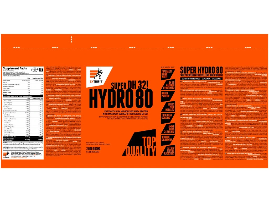 Oproti jiným proteinovým přípravkům vyniká Super Hydro 80 DH32 vysokým obsahem krátkých peptidů (průměrná molekulární hmotnost 1,6 kilodaltonů), takže jej můžete konzumovat po tréninku, popř. i před ním. Příjem toho vysoce kvalitního zdroje proteinu přispívá k růstu svalové hmoty a k jejímu udržení v situacích, kdy je ohrožena katabolizací. Výrobek dodáváme v čokoládové příchuti s typickou hořkostí syrovátkového hydrolyzátu DH32. Určeno pro zvláštní výživu - vhodné pro sportovce a pro osoby při zvýšené tělesné zátěži. Super Hydro DH32 má typickou hořkokyselou chuť, kterou není možné srovnávat s chutí jakéhokoli jiného proteinu! Upozorňujeme důrazně na tuto specifickou vlastnost produktu Super Hydro DH32, která je způsobena mimořádně vysokým stupněm hydrolyzace syrovátkového proteinu! Proteiny EXTRIFIT® – česká výroba Naše proteiny vyrábíme pod jednou střechou v Dolním Újezdě: vlastní vývoj, vlastní technologie, naše odpovědnost za každý gram. Celý proces držíme pevně v rukou – od výběru těch nejlepších surovin, přes testování a míchání, až po balení a expedici. Každou šarži si hlídáme sami. Žádné anonymní fabriky, žádný outsourcing. Jen precizní výroba a výsledek, na který se tvoje svaly můžou spolehnout – ať jsi profík, nebo nováček. Doporučené dávkování: závisí na tělesné hmotnosti, sportovní aktivitě a složení stravy doporučujeme rozložit denní dávku (2 - 3 odměrky) do 2 – 3 porcí díky vysokému obsahu krátkých peptidů s rychlou utilizací je tento protein vhodný pro konzumaci po tréninku, popř. i před tréninkem a ráno nalačno rozmixujte obsah 1 odměrky (30 g) Super Hydro 80 DH32 ve 150 - 200 ml vody Tabulka nutričních hodnot: Průměrný obsah energie a živin: 100 g 30 g Energetická hodnota 1 623 kJ / 386 kcal 487 kJ / 116 kcal Tuky 7 g 2,1 g - z toho nasycené mastné kyseliny 0,7 g 0,2 g Sacharidy 7,4 g 2,2 g - z toho cukry 1,8 g 0,5 g Vláknina 1,1 g 0,3 g Bílkoviny 73 g 22 g Sůl 0,18 g 0,05 g Typický profil aminokyselin: 100 g 30 g Alanin 3 859 mg 1 158 mg Arginin 2 191 mg 657 mg Cystein 1 921 mg 576 mg Glycin 1 526 mg 458 mg Histidin 1 458 mg 438 mg Kyselina asparagová 8 612 mg 2 584 mg Kyselina glutamová 13 776 mg 4 133 mg Lysin 7 306 mg 2 192 mg Methionin 1 453 mg 436 mg Fenylalanin 2 596 mg 779 mg Isoleucin 4 544 mg 1 363 mg Leucin 8 436 mg 2 531 mg Valin 4 615 mg 1 385 mg Celkem BCAA 17 595 mg 5 279 mg Prolin 4 556 mg 1 367 mg Serin 4 269 mg 1 281 mg Threonin 5 809 mg 1 743 mg Tryptofan 1 125 mg 337 mg Tyrosin 2 453 mg 736 mg Celkem aminokyseliny 80 505 mg 24 151 mg Složení: enzymaticky štěpený hydrolyzovaný syrovátkový protein se stupněm hydrolýzy DH32 - tvoří 100 % obsahu bílkovin výrobku (obsah bílkovinných frakcí: beta laktoglobulin 4 %, alfa laktalbumin 9 %, imunoglobulin 1 %, bovinní sérový albumin 4 %, bílkovinné frakce syrovátky s molární hmotností 500 - 1000 Da 17 %, bílkovinné frakce syrovátky s molární hmotností < 500 Da 65 %) přídatné látky: odtučněné kakao, aroma, steviol-glykosidy (sladidlo z rostliny stévie – přírodního původu), sukralóza (sladidlo) Upozornění: Skladujte v suchu při teplotě do 25 °C, pečlivě uzavřené. Po otevření spotřebujte do šesti měsíců. Chraňte před mrazem a přímým slunečním zářením. Není určeno pro děti, těhotné a kojící ženy. Výrobek není určen jako náhrada pestré stravy. Nepřekračujte denní doporučenou dávku. Výrobce neručí za škody, vzniklé nevhodným použitím nebo skladováním. Spotřebujte do data uvedeného na obalu. Upozornění pro alergiky: výrobek obsahuje bílkoviny z kravského mléka včetně laktózy.Jedná se o doplněk stravy.