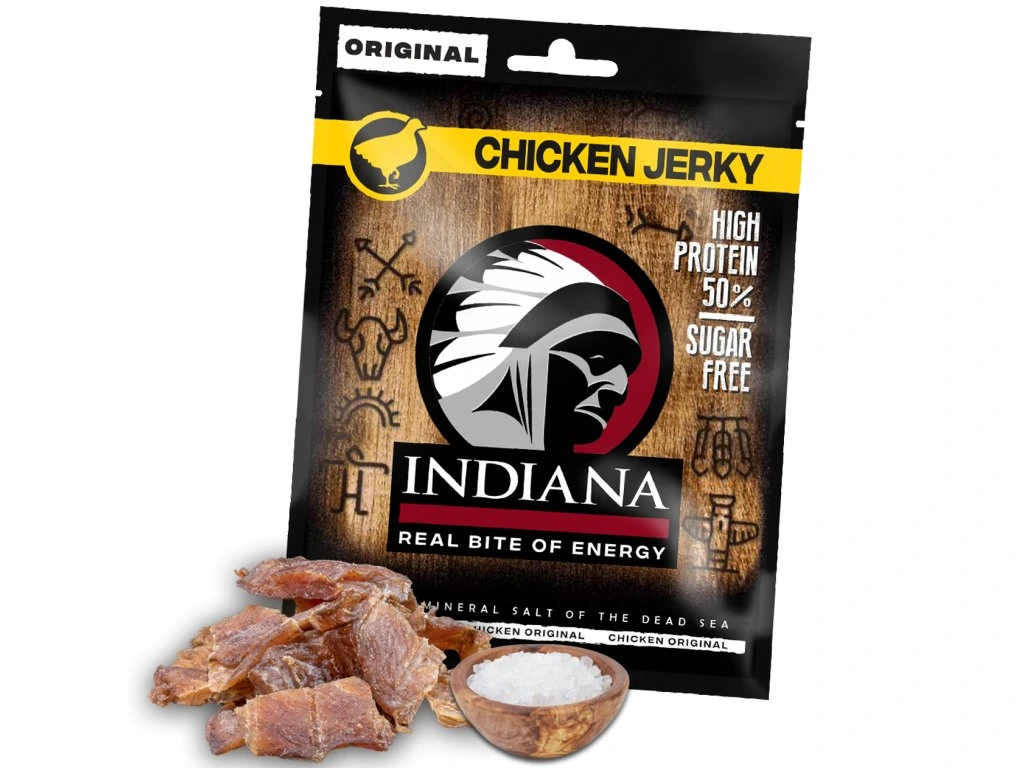 Jerky obecně označuje syrové maso, ze kterého je odstraněn tuk a následně je nakrájeno a vysušeno. Indiana Jerky jako takové pak náš náčelník vyrábí podle starých indiánských receptur. Indiana Jerky jsou tence nakrájené plátky libového masa, dále marinované, sušené a zauzené. Sušení probíhá několik hodin tak, aby si výchozí surovina zachovala jak přirozenou chuť masa, tak svou šťavnatost a pružnost. Pro sportovce nebo zdatného výletníka není zdravější, rychlejší a výživnější svačinky než sáček Indiana Jerky. Je to lehká, na dotek nemastná pochoutka, která obsahuje až 73 % proteinů a jen minimum tuku. Pro výrobu byl zvolen závod, jež splňuje nejpřísnější hygienické normy. Zde je Jerky vyráběno na strojích v majetku firmy Indiana s.r.o.. Přednosti: minimálně 50 % bílkovin maximálně 4 % tuku minimum cukru bez lepku bez přidaných glutamátů sůl z mrtvého moře Tabulka nutričních hodnot: 25 g 100 g Energetická hodnota 251 kJ 1005 kJ Energetická hodnota 60 kcal 238 kcal Tuky 0,9 g 3,4 g z toho nasycené 0,3 g 1 g Sacharidy 0,3 g 1,3 g z toho cukry < 0,5 g < 0,5 g Bílkoviny 13 g 50 g Sůl 1 g 4,10 g Složení: kurecímaso, jedlá sůl, sůl z mrtvého moře, bílkovinný sojový hydrolyzát, kvasnicový extrakt, vinný ocet, pepř, aroma, kouřové aroma, česnek, konzervant: dusitan sodný. Upozornění: Doporučené skladovací teploty jsou +5 až +30 °C. Minimální doba trvanlivosti 12 měsíců. Každé balení obsahuje absorbér kyslíku, který zachovává chuť a aroma bez jakékoli negativní kontaminace po celou dobu trvanlivosti produktu.Jedná se o doplněk stravy.