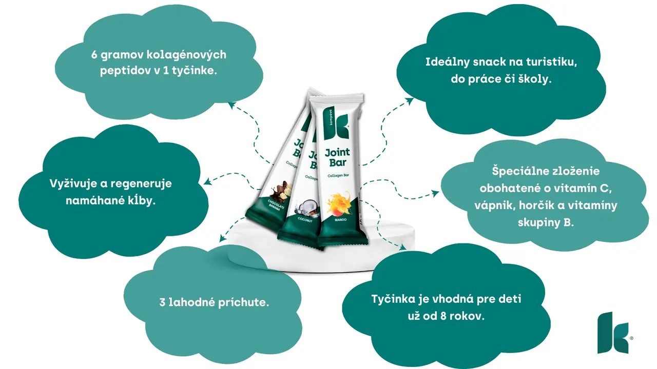 Kolagénová tyčinka Joint Bar obsahuje špeciálnu zmes kolagénových peptidov, vitamínov a minerálov, ktoré posilňujú a regenerujú namáhané kĺby. Kolagénové peptidy tvoria signalizáciu pre telo na tvorbu vlastného kolagénu. Kolagén je základnou stavebnou hmotou kĺbovej chrupavky, väzív a šliach a zabezpečuje ich pružnosť a pevnosť.