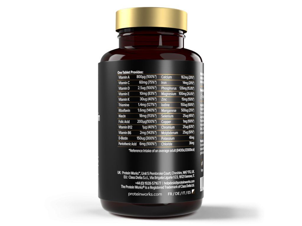 Hydrogenfosforečnan vápenatý, oxid horečnatý, mikrokrystalická celulóza, chlorid draselný, kyselina askorbová, fumarát železnatý, vitamín E (nikotínamid), oxid zinočnatý, stearát horečnatý, celulózový povlak, vitamín A, oxid kremičitý, pantotenát vápenatý, vitamín D2, bezvodý síran meďnatý, pyridoxín hydrochlorid, tiamín HCL, riboflavín, síran manganatý, vitamín K, kyselina listová, jodid draselný, D-biotín, kyanokobalamín, chlorid chromitý, molybdénan sodný, selenit sodný bezvodý.