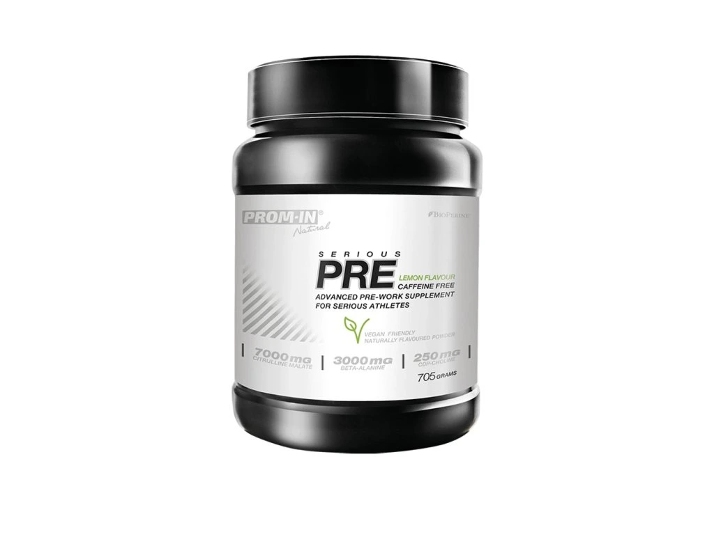 Serious PRE 2.0 Natural vychází ze stejného funkčního konceptu jako základní varianta, ale je ochucen výhradně přírodními aromaty a stevií – bez syntetických barviv a sladidel. Zachovává plnou účinnost ergogenní osy citrulin – beta-alanin – kreatin HCl a neurokomplexu tyrosin – cholin – theanin, přičemž eliminuje látky, které by mohly zbytečně zatěžovat detoxikační nebo nervový systém.Cílem je maximální čistota složení a dlouhodobá snášenlivost bez kompromisu ve fyziologické účinnosti. Chuť je přirozeně jemnější – pro ty, kteří se chtějí vyhnout jakýmkoli aditivům. Serious PRE 2.0 - Natural – pre-workout bez aditiv, ochucený přírodou PROM-IN® Serious PRE 2.0 - Natural vychází ze stejného funkčního konceptu jako základní varianta, ale je ochucen výhradně přírodními aromaty a stevií – bez syntetických barviv a sladidel. Zachovává plnou účinnost ergogenní osy citrulin – beta-alanin – kreatin HCl a neurokomplexu tyrosin – cholin – theanin, přičemž eliminuje látky, které by mohly zbytečně zatěžovat detoxikační nebo nervový systém. Cílem je maximální čistota složení a dlouhodobá snášenlivost bez kompromisu ve fyziologické účinnosti. Chuť je přirozeně jemnější – pro ty, kteří se chtějí vyhnout jakýmkoli aditivům. PROM-IN® Serious Natural PRE 2.0 a podpora výkonu Výkon při fyzické zátěži je limitován průtokem krve, schopností pufrovat kyselé metabolity a rychlou obnovou energie. PROM-IN® Serious PRE 2.0 proto obsahuje kombinaci tří látek, jejichž účinnost je dobře dokumentována. L-citrulin malát (7000 mg) – citrulin je prekurzor argininu a tím i oxidu dusnatého (NO), který podporuje vasodilataci a zásobování svalů živinami. Forma malátu přidává výhodu: kyselina jablečná se účastní Krebsova cyklu a může podpořit produkci energie. Studie ukazují, že dávky nad 6 g citrulin malátu zlepšují vytrvalost a oddalují pocit únavy (Bailey et al., 2015; Pérez-Guisado et al., 2010). Beta-alanin (3000 mg) – známý prekurzor karnosinu, který funguje jako pufr vodíkových iontů. Při pravidelném užívání zvyšuje odolnost při zatížení v délce 1–4 minuty, tedy v pásmu, kde vznikají největší adaptační podněty. Meta-analýza (Saunders et al., 2017) potvrzuje významný vliv na intervalový výkon. Kreatin HCl (3000 mg) – vysoce rozpustná forma kreatinu, která umožňuje dosáhnout obdobného účinku jako 5 g monohydrátu, ale s nižším rizikem gastrointestinálních obtíží. EFSA potvrzuje, že denní příjem 3 g kreatinu zvyšuje fyzickou výkonnost při opakovaném krátkodobém intenzivním cvičení. Synergie: Citrulin zlepšuje prokrvení, beta-alanin oddaluje zakyselení a kreatin obnovuje zásoby ATP. Společně tvoří trojúhelník výkonu: více opakování, vyšší intenzita, delší výkon. PROM-IN® Serious PRE 2.0 - natural a podpora během zátěže Trénink není doba regenerace, ale období maximálního výkonu. Proto PROM-IN® Serious PRE 2.0 - natural obsahuje látky, které se mohou využít přímo během fyzické aktivity. BCAA (L-leucin 3000 mg, L-isoleucin 1500 mg, L-valin 1500 mg) – větvené aminokyseliny se metabolizují přímo ve svalech, čímž poskytují okamžitě dostupný zdroj energie. Leucin navíc aktivuje signální dráhu mTOR, která je klíčová pro následnou adaptaci na zátěž (Shimomura et al., 2006). Taurin (1000 mg) – osmolyt a antioxidant, který moduluje transport vápníku a podporuje stabilní kontrakci svalových vláken. Jeho ochranná úloha při intenzivní zátěži je doložena řadou studií (Ghandforoush-Sattari et al., 2010). Synergie: BCAA poskytují okamžité palivo, taurin stabilizuje prostředí buněk. Výsledkem je delší a stabilnější výkon, kdy energie neklesá skokově, ale zůstává kontrolovaná. PROM-IN® Serious PRE 2.0 - natural a podpora koncentrace Významným faktorem výkonu je nervový systém. PROM-IN® Serious PRE 2.0 - natural proto kombinuje látky, které podporují kognitivní stabilitu a soustředění bez nadměrné stimulace. L-tyrosin (1000 mg) – prekurzor katecholaminů (dopamin, noradrenalin). Studie ukazují, že suplementace tyrosinem může podpořit kognitivní výkon při stresu a únavě (Jongkees et al., 2015). CDP-cholin (250 mg) – zdroj cholinu pro syntézu acetylcholinu, neurotransmiteru klíčového pro kognitivní výkon a pozornost. L-theanin (250 mg) – aminokyselina obsažená v čaji. Výzkumy potvrzují, že přispívá ke stavu „klidné bdělosti“ – zlepšuje koncentraci a zároveň tlumí nadměrnou nervovou aktivaci (Unno et al., 2018). Acetyl-L-karnitin (500 mg) – derivát karnitinu, který podporuje mitochondriální metabolismus a dlouhodobě přispívá k mentálnímu výkonu a odolnosti (Montgomery et al., 2003). Synergie: Tyrosin a CDP-cholin podporují neurotransmise dopaminu a acetylcholinu, theanin stabilizuje nervový systém a ALCAR zajišťuje energetické zázemí neuronů. Společně vytvářejí stav soustředěné energie bez přestimulace. PROM-IN® Serious PRE 2.0 - natural a mikronutrienty Každý detail hraje roli. Proto je PROM-IN® Serious PRE 2.0 doplněn o mikronutrienty a bioaktivní složky v dávkách, které jsou funkční a zároveň bezpečné. Niacin (30 mg, 188 % RHP) – prekurzor koenzymů NAD+ a NADP+, které jsou nezbytné pro stovky enzymatických reakcí spojených s energetickým metabolismem. Flush efekt souvisí s vazodilatací a je přirozeným důsledkem jeho účinku. V kontextu pre-workoutu niacin podporuje efektivní tok energie a plynulé využití substrátů během výkonu. Vitamin B6 (pyridoxal-5’-fosfát, 1,1 mg = 78 % RHP) – aktivní forma vitaminu B6, která se účastní metabolismu aminokyselin a tvorby neurotransmiterů (dopamin, serotonin, GABA). Současně podporuje glukoneogenezi, tedy tvo