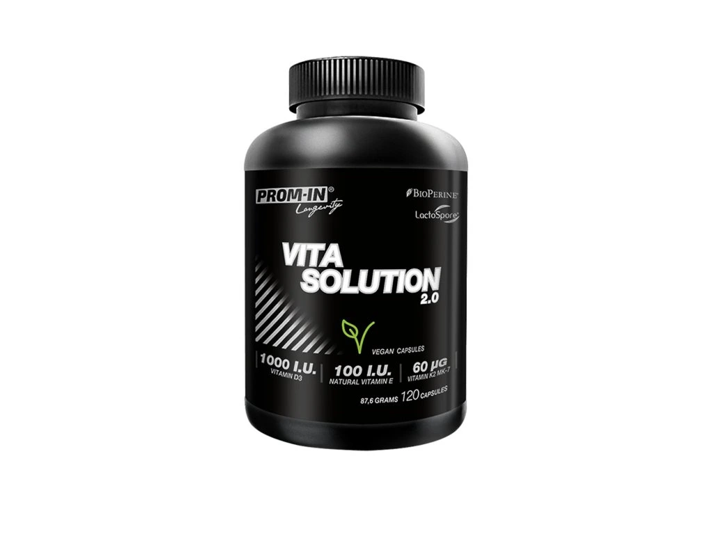 VITA SOLUTION 2.0 – multivitamin pro nejnáročnější VITA SOLUTION 2.0 je inovovaný multivitamínový a minerální komplex, navržený speciálně pro fyzicky aktivní jedince. Obsahuje vědecky ověřené bioaktivní formy vitamínů a minerálů, které zajišťují maximální využitelnost v těle. Díky pokročilé technologii kapslování a výhradně chelátovým vazbám minerálů přináší maximální biologickou dostupnost a optimální absorpci. VITA SOLUTION 2.0 je navržen pro ty, kdo nechtějí kompromisy v kvalitě, ale požadují efektivní složení bez balastních látek, umělých pojiv a špatně vstřebatelných anorganických forem minerálů. VITA SOLUTION 2.0 V BODECH Multikomponentní složení – bez složek, které by bránily vstřebávání živin Chelátové formy minerálů – maximální biologická dostupnost a využitelnost B-komplex v optimálních dávkách – podpora energetického metabolismu a nervového systému Beta-karoten jako přirozený zdroj vitamínu A – bezpečnější forma bez rizika hypervitaminózy D-alfa tokoferyl sukcinát (vitamin E) – netoxická a vysoce biologicky dostupná forma Vitamin K2 (MK-7) – klíčový pro zdraví kostí a cév Chrom (pikolinát chromitý) – podpora metabolismu cukrů a inzulinové citlivosti Extrakt z černého pepře (BioPerine®) – pro lepší absorpci živin 5MTHF-Ca (aktivní folát) – lepší využitelnost oproti syntetické kyselině listové Pyridoxal-5’-fosfát (P5P) – biologicky aktivní forma vitamínu B6 Klíčové živiny pro váš životní styl Sportovci, a nejen ti, mají zvýšené nároky na pokrytí potřeby důležitých vitamínů a minerálů, zejména vitamínů skupiny B, antioxidantů, vitamínu K, chromu, selenu a mědi. A právě proto VITA SOLUTION 2.0 nabízí optimalizované dávky těchto klíčových mikroživin. Zvýšený obsah vitamínů B-komplexu Vitamíny skupiny B jsou klíčové pro energetický metabolismus a nervový systém. Zvýšený obsah vitamínů B-komplexu v našem VITA SOLUTION 2.0 katalyzuje přeměnu živin na energii a celkově zlepšuje fyzický i duševní výkon. Zajistí regeneraci po náročných fyzických aktivitách a pomáhá v boji se stresem. Studie publikovaná v "International Journal of Sport Nutrition" prokázala jednoznačný vliv suplementace vitamínů B-komplexu na podporu výkonu a regenerace. Optimální absorpce Nešli jsme cestou produktů s desítkami ingrediencí jen pro efekt na etiketě. Místo toho jsme se zaměřili na vynechání opozitních složek, čímž jsme zajistili maximální absorpci a využitelnost všech klíčových vitamínů a minerálů. Kyselina listová ve formě folátu Ve VITA SOLUTION 2.0 jsme nově použili 5MTHF-Ca (vápníkovou sůl 5-methyltetrahydrofolátu) jako zdroj kyseliny listové pro jeho významně lepší využitelnost. Folát, biologicky aktivní forma vitamínu B9, je přímo dostupný pro tělo a nevyžaduje žádnou další metabolickou konverzi, na rozdíl od syntetické kyseliny listové. To zajišťuje vyšší vstřebatelnost a biologickou dostupnost. Folát je nezbytný pro syntézu DNA, růst buněk a tvorbu červených krvinek, což je klíčové pro sportovce během intenzivního tréninku a regenerace. Podporuje zdraví mozku, zlepšuje kognitivní funkce a přispívá k prevenci vrozených vad. Pyridoxal-5‘-fosfát (P5P) - aktivní forma vitamínu B6 VITA SOLUTION 2.0 nově využívá pyridoxal-5'-fosfát (P5P) jako zdroj vitamínu B6. P5P představuje biologicky aktivní koenzym vitamínu B6, který katalyzuje mnoho enzymatických procesů, včetně metabolismu aminokyselin a tvorby neurotransmiterů. P5P také optimalizuje syntézu hemoglobinu, což je klíčové pro okysličení tkání. Významnou roli hraje v regulaci hormonální aktivity a podpoře imunitního systému. Navíc působí proti glykaci, čímž přispívá k dlouhověkosti a ochraně před stárnutím. Chelátové minerály – maximální vstřebatelnost Většina doplňků obsahuje levné a špatně vstřebatelné anorganické formy minerálů, které tělo nedokáže efektivně využít. Ve VITA SOLUTION 2.0 proto používáme výhradně chelátové formy, které zajišťují maximální biologickou dostupnost a nezatěžují organismus nevyužitými rezidui. Chrom (pikolinát chromitý) – klíčový pro metabolismus cukrů a citlivost na inzulin. Mangan (bisglycinát manganatý) – nezbytný pro tvorbu kolagenu a zdraví kloubů. Měď (bisglycinát měďnatý) – podporuje tvorbu červených krvinek a energetický metabolismus. Selen (kvasnice obohacené selenem) – poskytuje biologicky aktivní selenoproteiny, které zvyšují antioxidační ochranu a podporují imunitu. Chelátová vazba umožňuje minerálům snadnější průchod střevní bariérou a až o 70 % vyšší vstřebatelnost oproti běžným formám. Kapslová technologie nové generace VITA SOLUTION 2.0 nově využívá pokročilou technologii kapslí, která kombinuje ochranu účinných složek s optimální absorpcí. Díky modernizovanému výrobnímu procesu a přímé kontrole nad produkcí v České republice jsme dosáhli nové úrovně kvality a preciznosti. Díky pokročilé technologii kapslování dochází k kontrolovanému uvolňování živin ve správný čas a na správném místě. Kapsle se rozpouštějí až v žaludku, čímž eliminuje riziko předčasného rozpadu v jícnu a zajišťuje maximální biologickou dostupnost všech aktivních složek. Díky této inovaci poskytuje VITA SOLUTION 2.0 stejnou ochranu účinných látek jako tablety, ale s výrazně lepší vstřebatelností. Vita Solution 2.0 – kompletní podpora pro vaše zdraví VITA SOLUTION 2.0 je navržen tak, aby poskytoval komplexní podporu fyzicky i mentálně aktivním jedincům. Díky biologicky dostupným vitamínům a minerálům, optimalizované absorpci a špičkové kapslové technologii přináší n